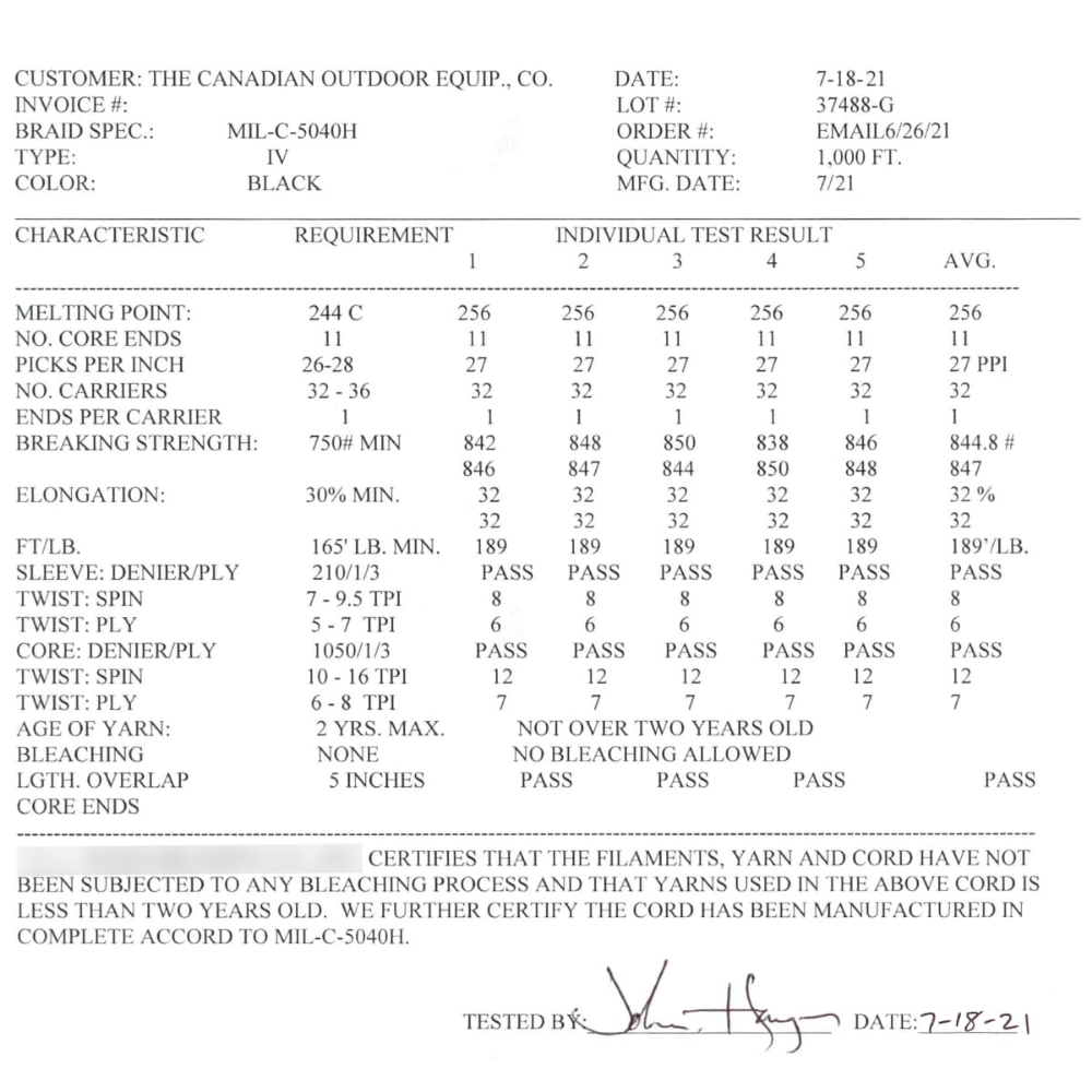 550 paracord is usually plenty strong enough for most outdoor activities. Should you require something stronger however, we're pleased to offer 550 paracord's big brother: 750 paracord. Rated for loads of 750 lbs (but capable of supporting loads of 830 lbs+), our true military grade (not consumer grade) MIL-C-5040H Type 4 mil spec 770 paracord is made in the USA by a certified government contractor. Featuring 11 interior strands (including a marker strand), and fibres that are never bleached, and never more than 2 years old, our military grade nylon 750 paracord ensures you can trust your line to perform when you need it to. 750 paracord diameter: 4mm (1/8")