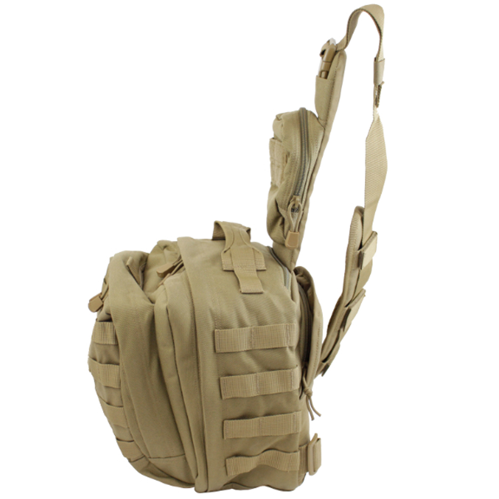 Experience the ultimate in tactical efficiency with our 11L MOLLE Sling Single Strap Bag, crafted from durable and lightweight 1050D nylon. This water-resistant bag is designed for the demands of the field, featuring a covert TacTec pocket at the rear and a secondary double-zip pocket for quick access. Stay hydrated on the go with a dedicated hydration pocket and keep your essentials organized with its structured storage area. The exterior boasts a MOLLE web platform for additional gear attachment, and a fleece-lined sunglass pocket protects your eyewear. The bag's dimensions, 10.5” H x 9” L x 5” D for the main compartment and 9.5” H x 8” L x 2” D for the front compartment, ensure ample space for your necessities. It also includes tech pocket pass-through cord slots, a hook and loop flag patch, and YKK® self-healing zippers for durability. Customize this versatile sling pack to your needs and enjoy the comfort of an adjustable cushioned shoulder strap with an additional tech pocket. The 11L Tactical MOLLE Sling Single Strap Bag is a premium quality gear pack that can act as a tactical pack, a grab-and-go bag, or a quick and easy shoulder pack for school or travel.