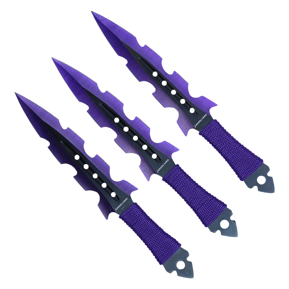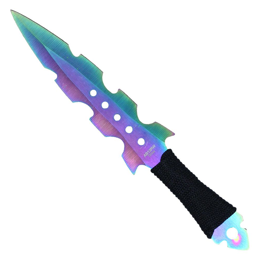 Introducing a powerful 3-piece throwing knife set built for performance and precision. Each knife has a blade made of black/silver stainless steel with cut-out ridges that improve aerodynamics during flight and a pointy tip. These two-tone knives have an overall length of 7.5 inches and are well-balanced for accurate throwing. Durability and stability are guaranteed by the full tang structure. The handles are cord-wrapped to provide a safe and snug grip for the best possible control. A sheath is also included in this kit for secure and practical storage. With this functional and fashionable 3-piece throwing knife set, improve your throwing abilities.