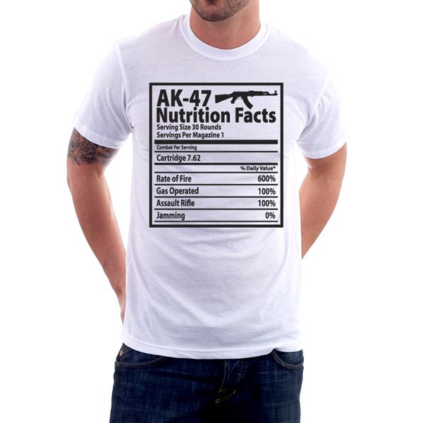 Show off your unique style with the AK-47 Nutrition Facts Custom Printed T-shirt. This humorous and bold tee features a "nutrition facts" label design inspired by the iconic AK-47, adding a fun twist for gun enthusiasts or collectors. Made from soft, durable fabric, it’s comfortable and perfect for casual wear or as a statement piece.