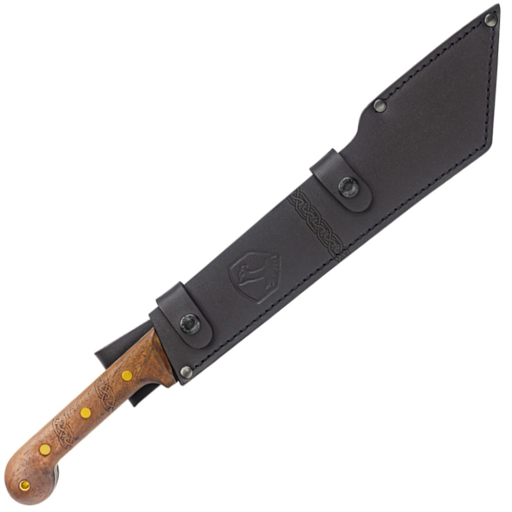 Featuring a large tanto 1075 blade, the Argyll can effortlessly handle the most demanding wilderness tasks, from chopping to clearing to cutting. Its walnut wood handle is nearly unbreakable and will amazingly maintain a non-slip control even on your two-hundredth swing. Included is also a brown leather sheath with a belt loop that makes its transportation real easy.