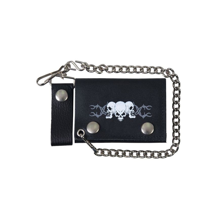 Black, soft leather, tri-fold four inch wallet. This wallet includes a detachable chain with snapping belt loop as well as a "Barbed Wire Skulls" screen print.