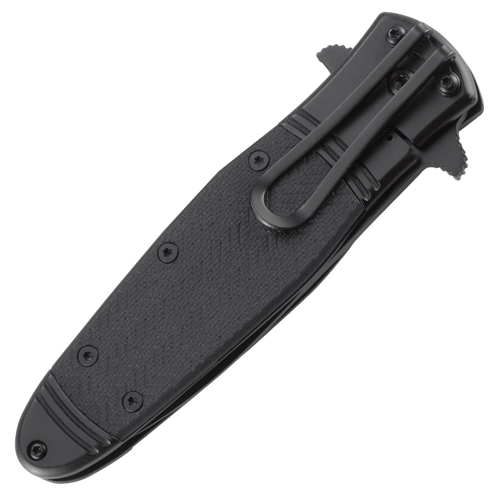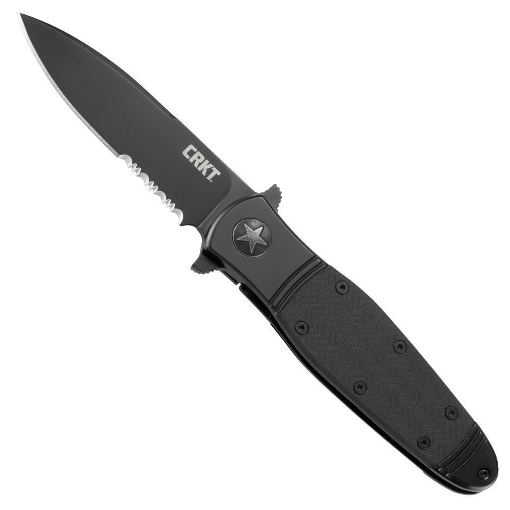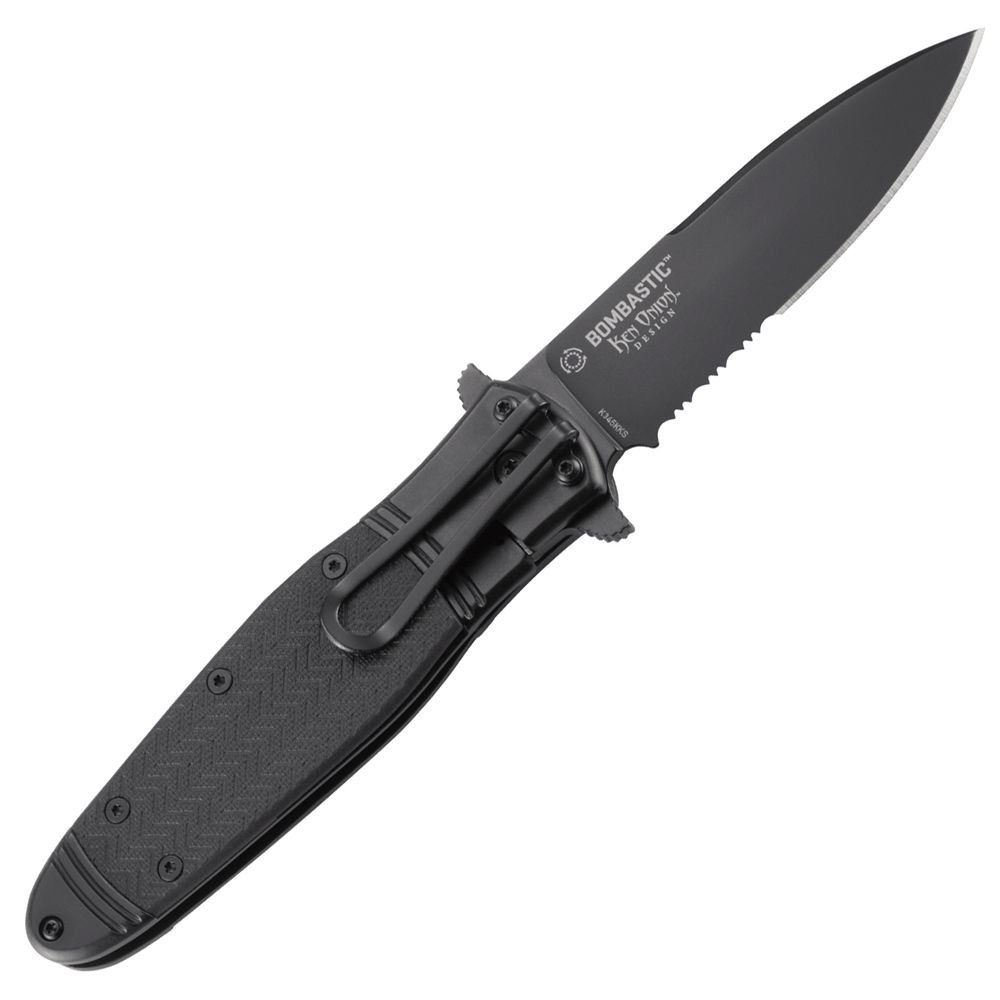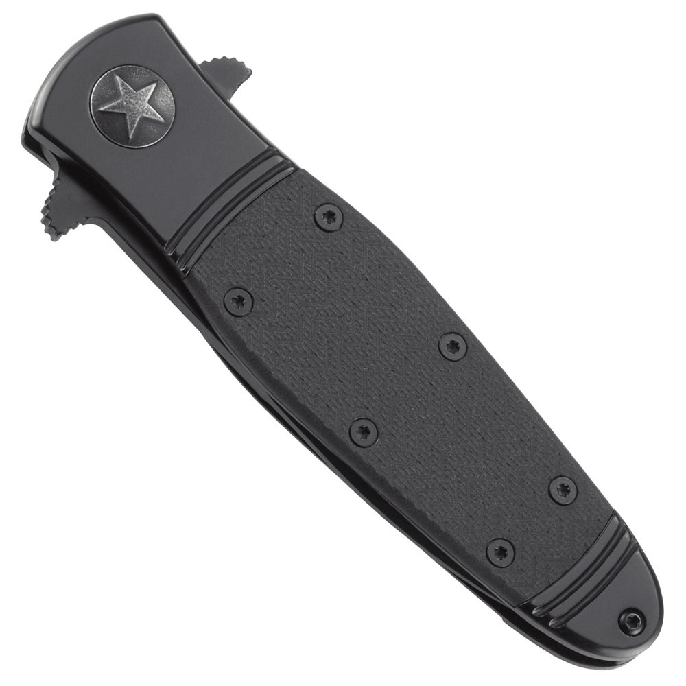 Modeled after the WWII bomber planes, the CRKT Bombastic folding knife joins the ranks in becoming a classic Ken Onion design. An IKBS ball bearing pivot system with a flipper smoothly deploys a sleek spear point blade that secures on a frame lock. The dual flippers also act as a hilt, adding another layer of safety. Its handle is made with a 2Cr13 stainless steel bolster complete with black chevron-textured glass reinforced nylon inlays. A single star embossed on the pivot bearing adds the final touch to the Bombastic’s old-school military aesthetic.