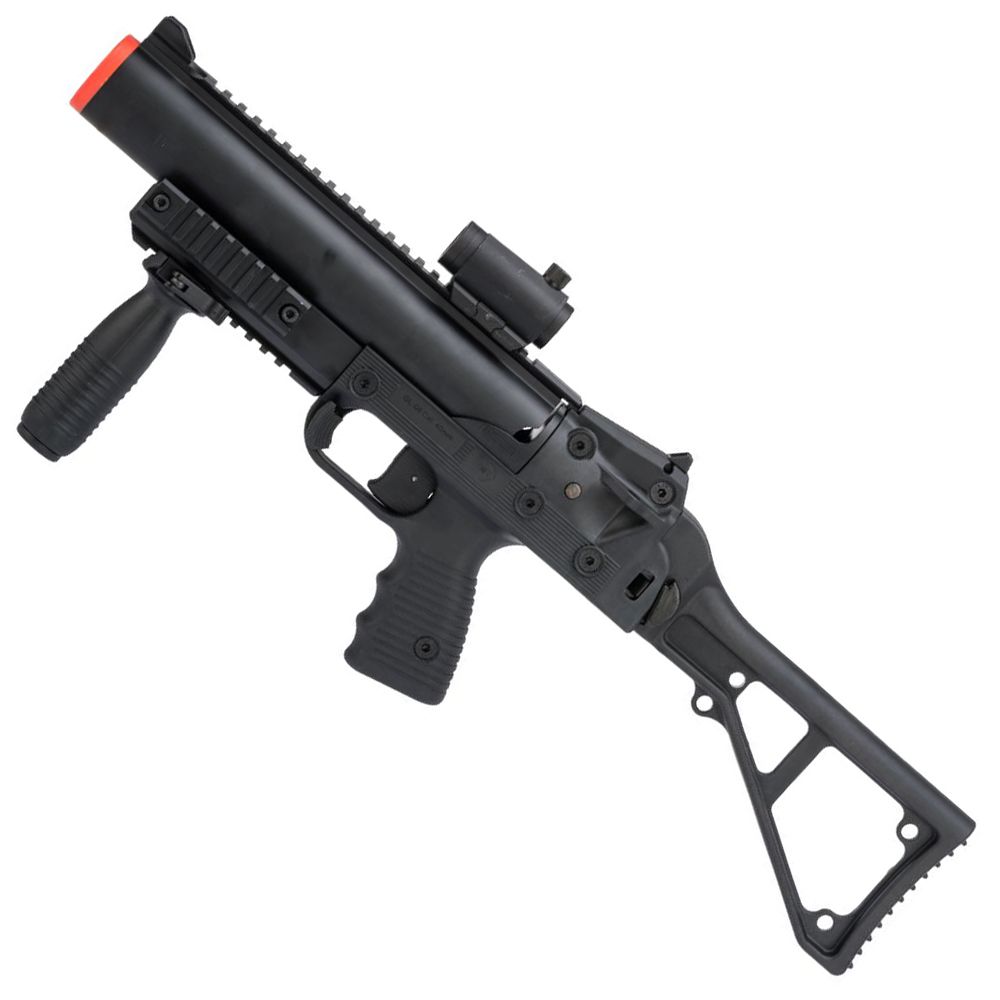 The B&T GL-06 is a fully licensed replica grenade launcher, originally made by the Brugger & Thomet, Switzerland. The stock and receiver are made of polymer and the barrel and front guard is metal. All four side rails are metal and will support any accessories imaginable. A quick-remove front grip is supplied to make the GL-06 complete. The GL-06 launcher takes any length airsoft grenade, which is a device that looks like a real world grenade, but uses a gas propellant to fire a variety of projectiles, like large amounts of 6 mm BB's. When inserted in a grenade launcher, and fired, it shoots all the BB's at once with a big blast, great for room clearing and suppressive fire.