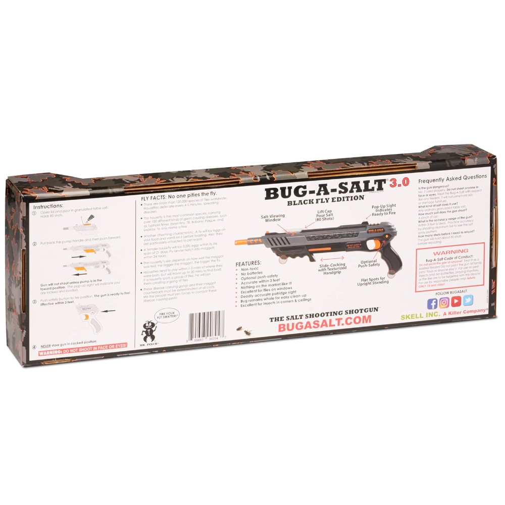 Why Settle For Traditional Pest Control When You Can Turn Bug Hunting Into An Exciting Challenge? The Bug-A-Salt 3.0 Salt Gun Brings Superior Accuracy, More Power, And Instant Results With Its Advanced Trigger System, Enhanced Salt Pattern, And Precise Patridge Sight. Take Down Flies, Mosquitoes, And Spiders Effortlessly - Even In Mid-Air! The Non-Toxic, Battery-Free Design Makes It Safe, Eco-Friendly, And Easy To Use Indoors Or Outdoors. Whether You’re A Casual Fly Hunter Or A Hardcore Pest Eliminator, This Salt Blaster Delivers Unmatched Performance And Endless Fun! Order Now And Experience The Future Of Pest Control!