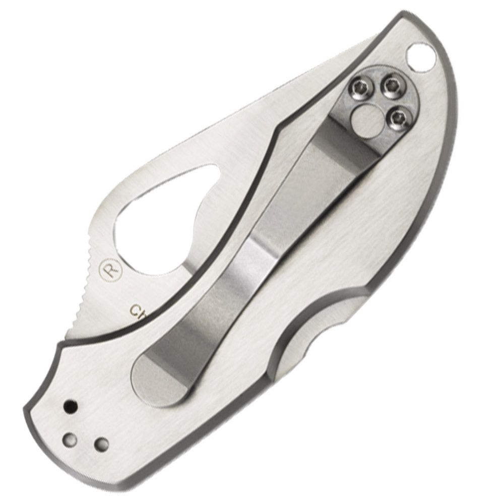 The handle is made of a front and back G-10 scale set over a stainless liner. G-10 is an epoxy-filled laminate with a weave-texture similar to cloth. It provides secure and steady grip when cutting, resists chemicals, oil and temperature extremes. The welcome addition of a four-way clip offers the option of carrying the folder tip-up/tip-down or left-right-handed and a lanyard hole located at the back of the handle accommodates a secondary-retentive thong or cord.