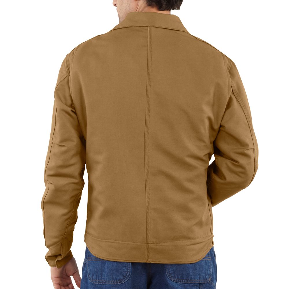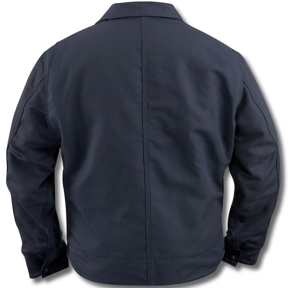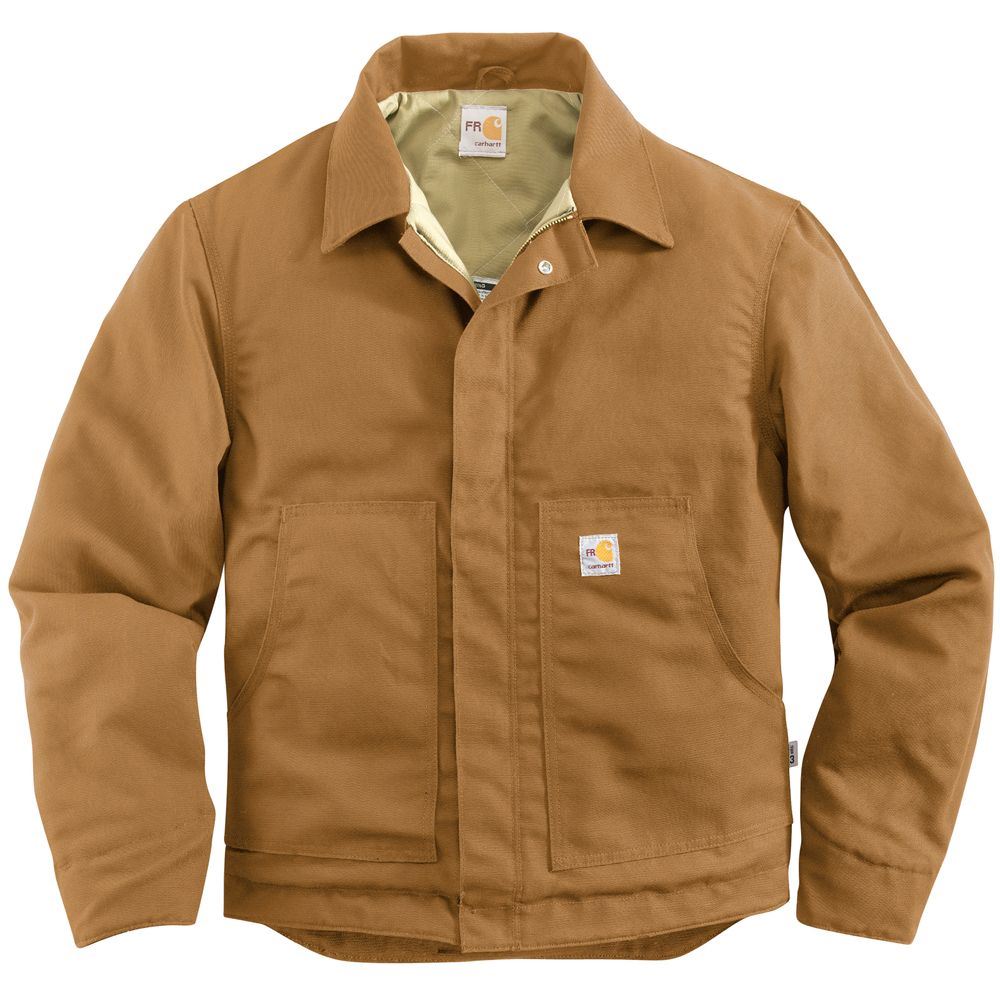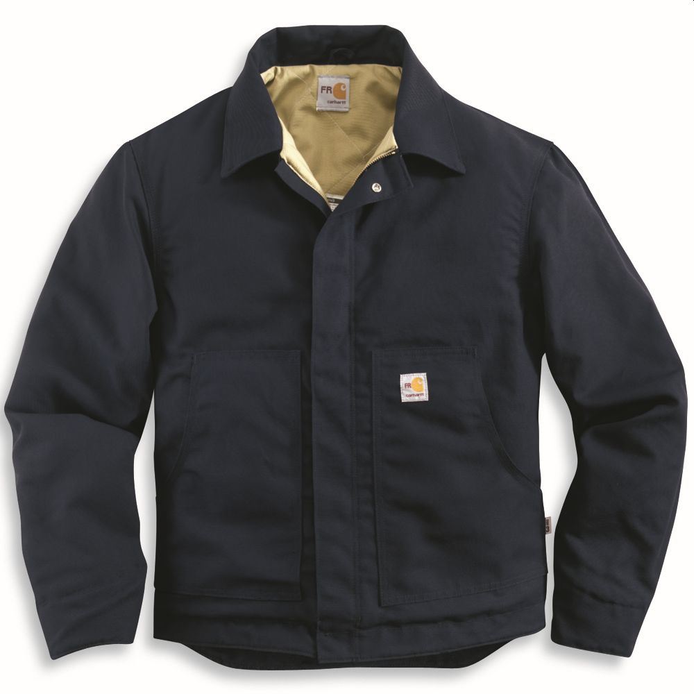 8.5-ounce FR canvas: 88% cotton/12% high-tenacity nylon 8.75-ounce FR quilt lining: FR modacrylic batting quilted to FR twill face cloth Brass front zipper with Nomex zipper tape that has inside and outside protective flaps Two inside patch pockets with FR hook-and-loop closures
