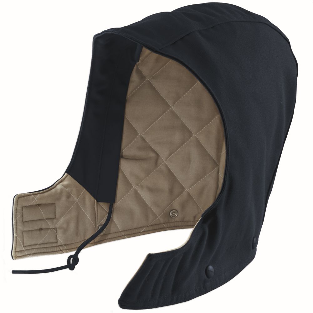 13-ounce, 100% cotton FR duck 11.5-ounce FR quilt lining: FR modacrylic batting quilted to twill face cloth Three-piece hood design for better fit Chin protector with FR hook-and-loop closure Adjustable Nomex FR draw cord Arc-resistant snaps for attachment to FR outerwear only