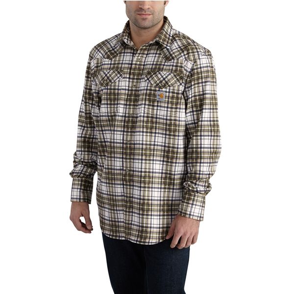 6.5-ounce FR Twill: 88% cotton/12% high-tenacity nylon NFPA 2112/HRC2 label sewn on sleeve placket Spread collar with snap-front button closure Front and back western-shaped yokes Two chest pockets with flaps and snap closures