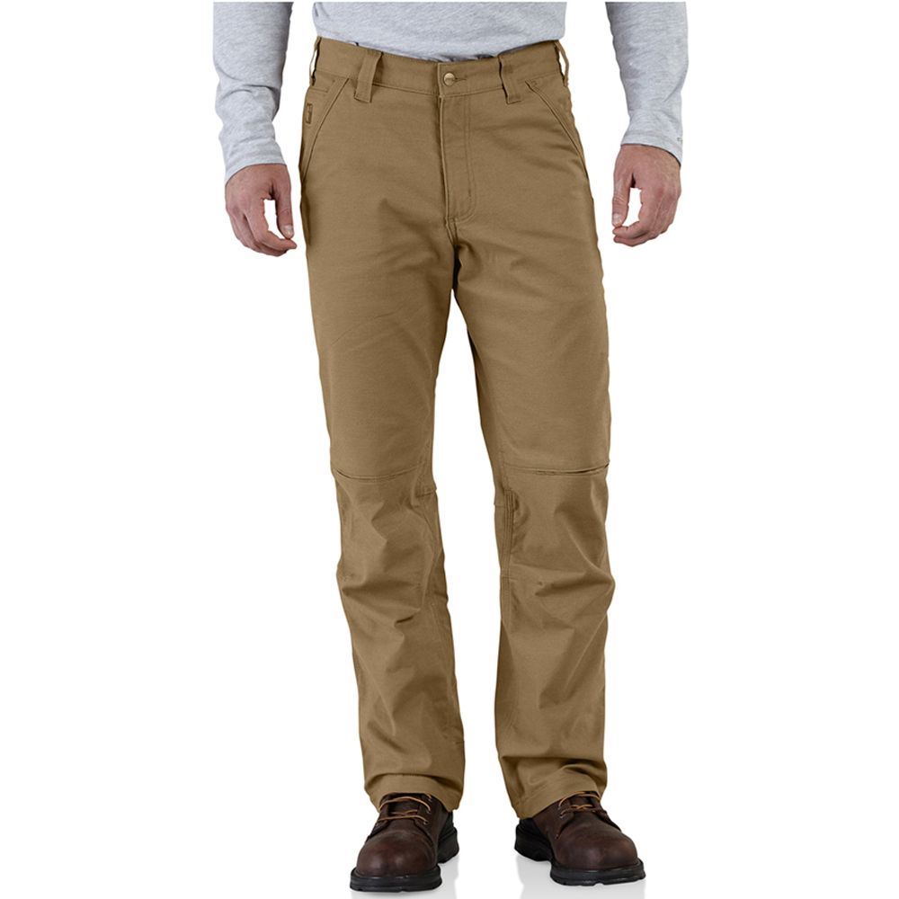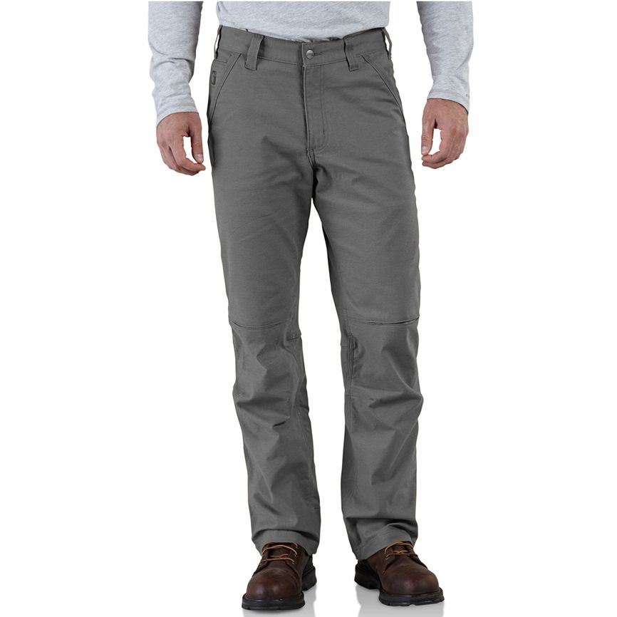 Quick Duck: 8-ounce, 59% cotton/39% polyester/2% spandex canvas keeps you moving Rain Defender durable water repellent finish Sits at the waist with a relaxed seat and thigh Comfortable gusseted crotch: there's an extra panel to increase your movement and take stress off the seams Bend and crouch with ease: articulated knees have a 4-way stretch panel
