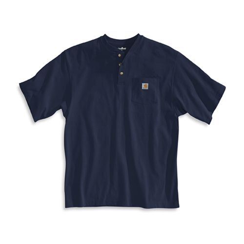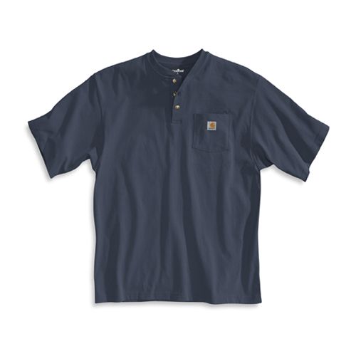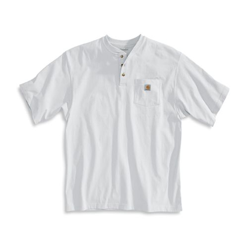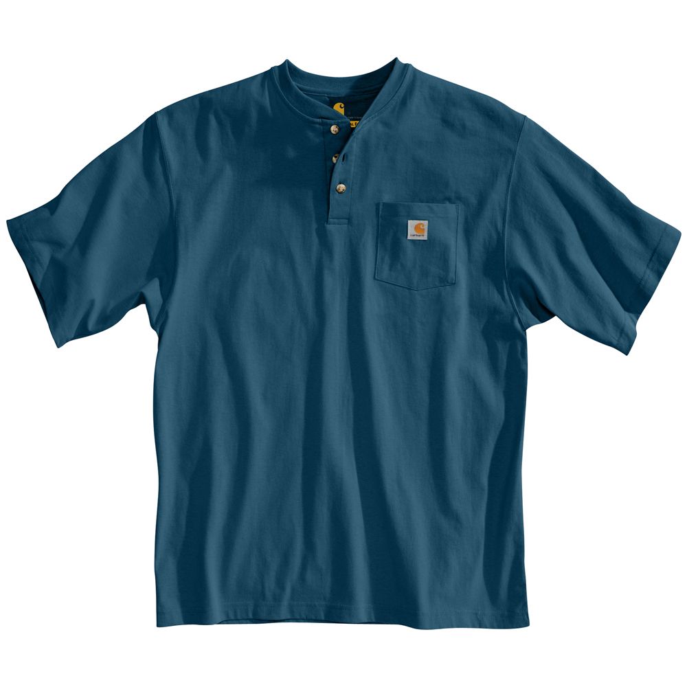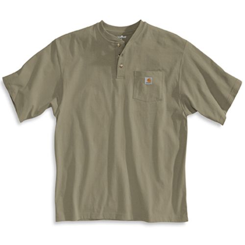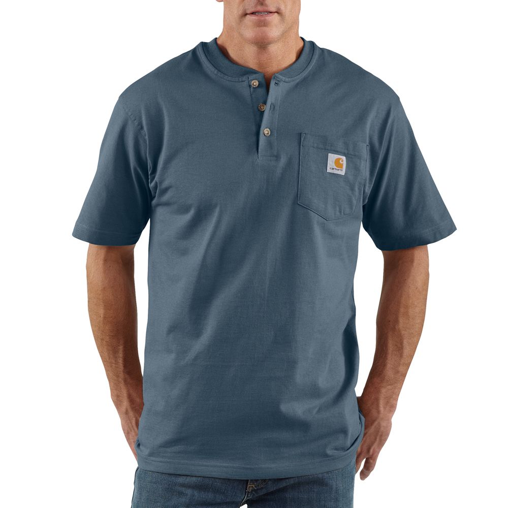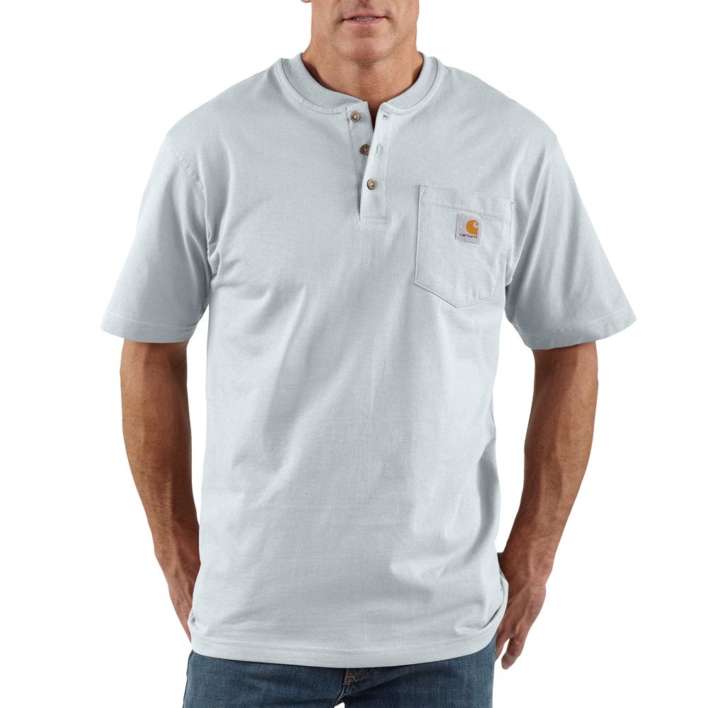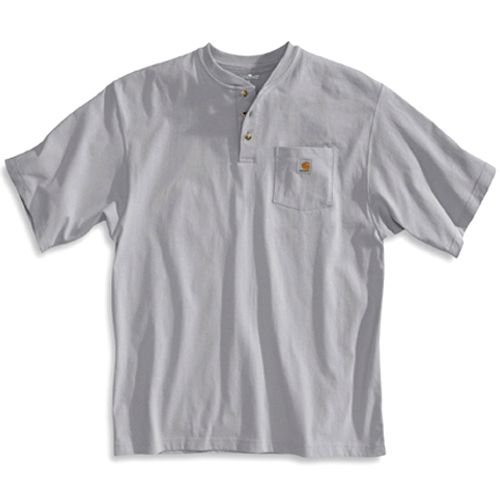 6.75-ounce, 100% cotton jersey knit Heather Grey fiber content is 90% cotton/10% polyester; Ash fiber content is 99% cotton/1% polyester Rib-knit collar with tagless neck label Henley collar with three-button front Side-seamed construction minimizes twisting Left-chest pocket with sewn-on Carhartt label