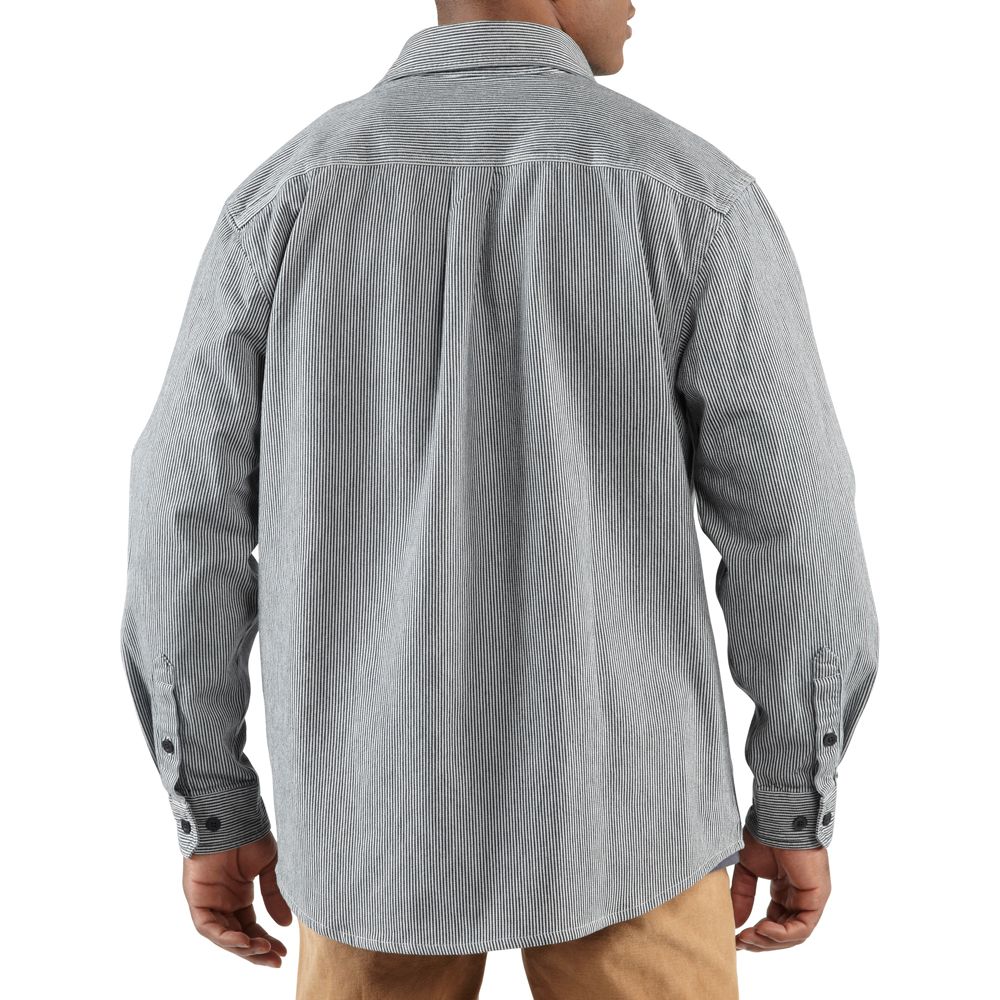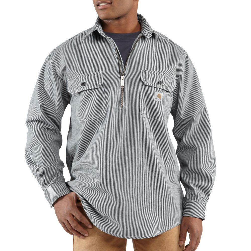 9.5-ounce, 100% cotton hickory stripe denim Spread collar with button closure and 8-inch zipper Two chest pockets with flaps and button closures Two-button adjustable cuffs with extended plackets Carhartt-strong triple-stitched main seams
