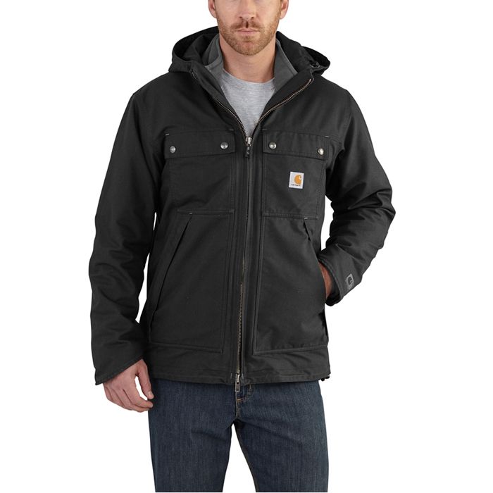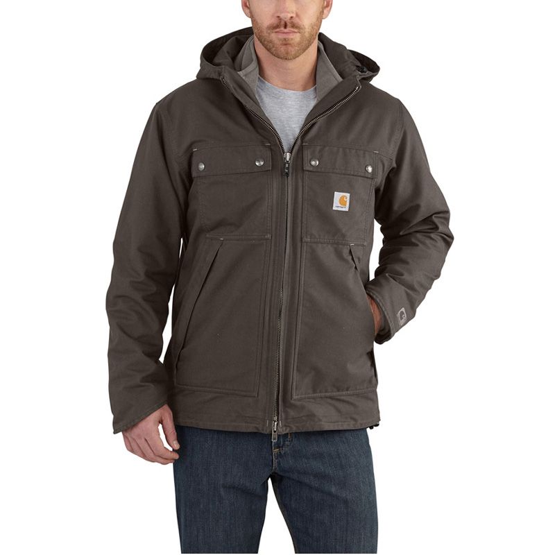Quick Duck: 8.5-ounce, 60% cotton, 40% polyester canvas with Rain Defender durable water repellent Featherweight with heavyweight protection, Quick Duck is 30% lighter and ounce-for-ounce as durable as sandstone Evenly distribute body heat with mesh lining through the body and taffeta lining in sleeves Quickly and easily reconfigure with two-way center front zipper with interior storm flap Always at-the-ready, the attached hood provides instant shelter for your melon Two easy-to-reach, 100% Carstrong lower pockets with fleece lining