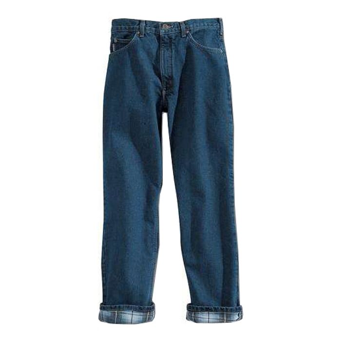 15-ounce, 100% cotton denim 4.5-ounce cotton flannel lining Sits at the waist Relaxed seat and thigh Stronger sewn-on-seam belt loops Two reinforced back pockets