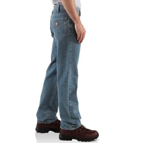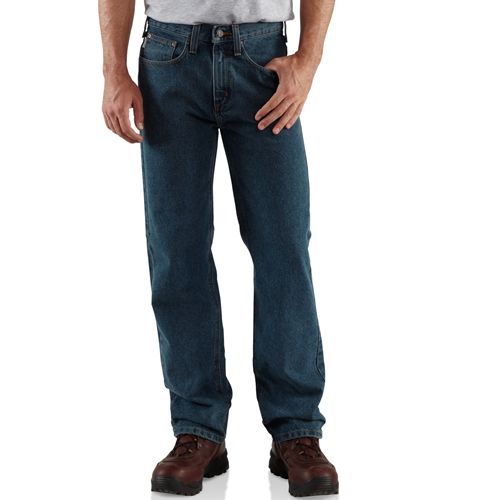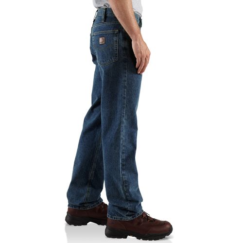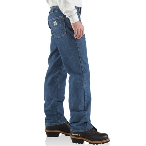 15-ounce, 100% cotton denim Sits at the waist Relaxed seat and thigh Stronger sewn-on-seam belt loops Straight leg opening