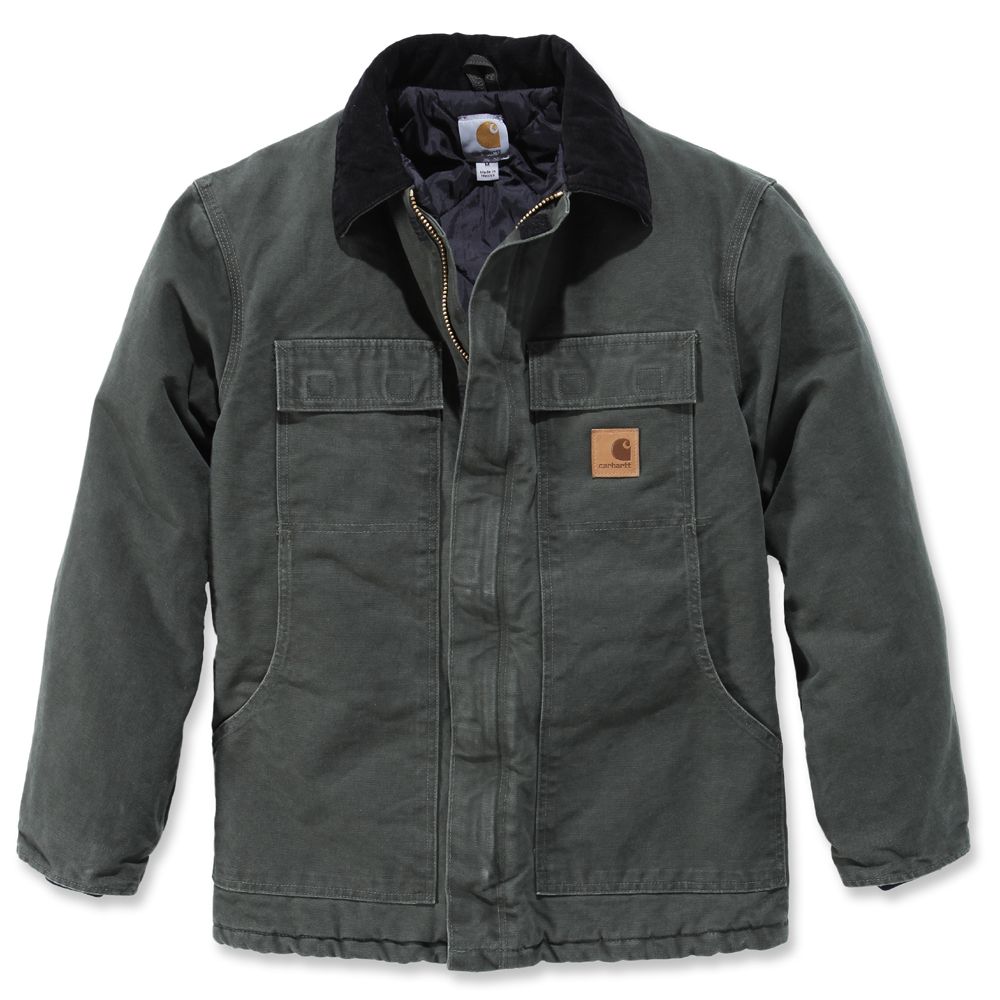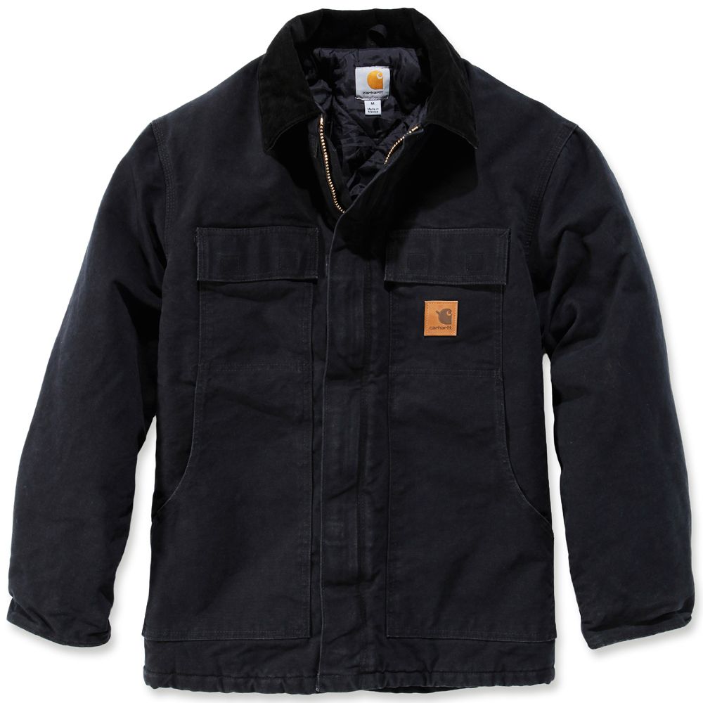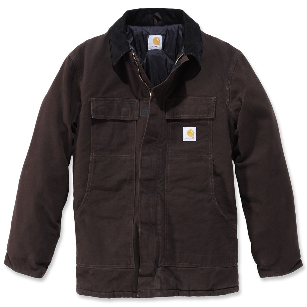 12-ounce, 100% cotton sandstone duck. Water repellent and Wind resistant. Nylon lining quilted to arctic-weight polyester insulation, Two inside pockets Two-way brass zipper plus storm flap with hook-and-loop closure Inner-sleeve, rib-knit storm cuffs Corduroy-trimmed collar with under-collar snaps for optional hood