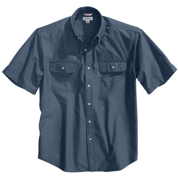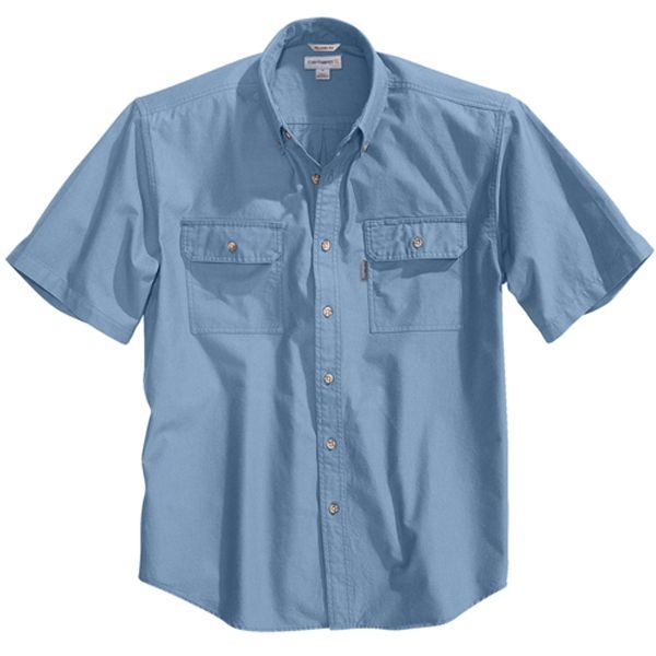 4.5-ounce, 100% cotton ring-spun chambray Garment washed for a soft finish and reduced shrinkage Button-down collar Two chest pockets with mitered flaps and button closures Shoulder pleats for ease of movement Carhartt-strong triple-stitched main seams