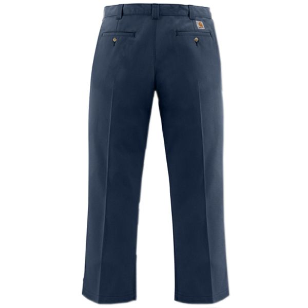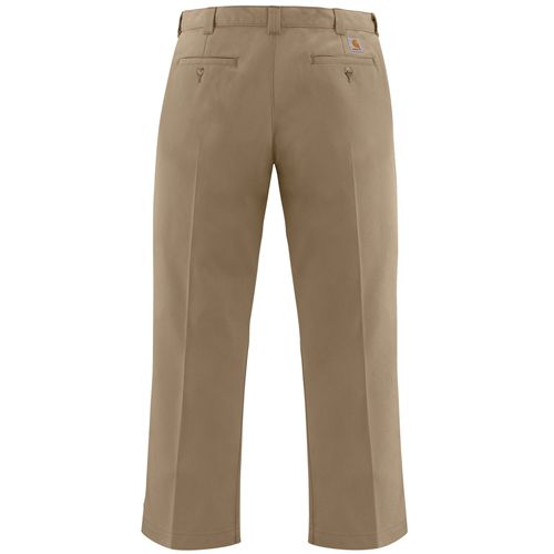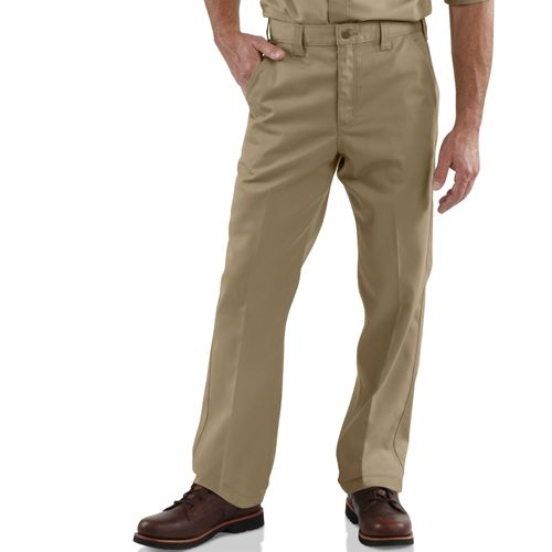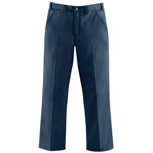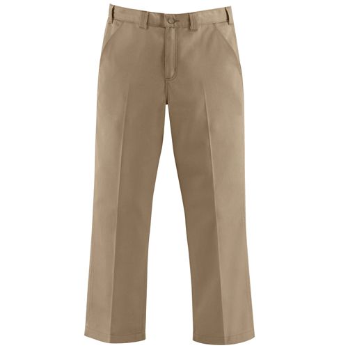 8.5-ounce, 65% polyester/35% cotton twill Wrinkle-resistant fabric Stain Breaker technology releases stains Permanent crease Sits slightly below the waistRelaxed seat and thigh