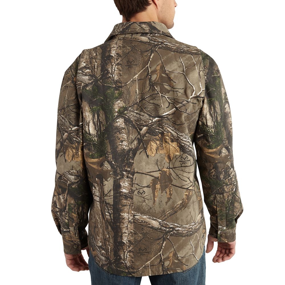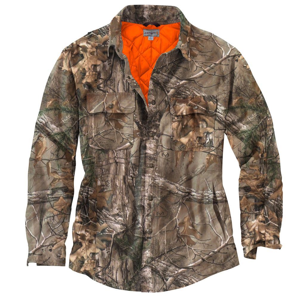 10-ounce, 100% cotton canvas with Realtree Xtra® camouflage pattern Quilt lining retains warmth Antique-finish brass snaps throughout Two chest pockets with rivet reinforcements Interior pocket Bi-swing back for range of movement
