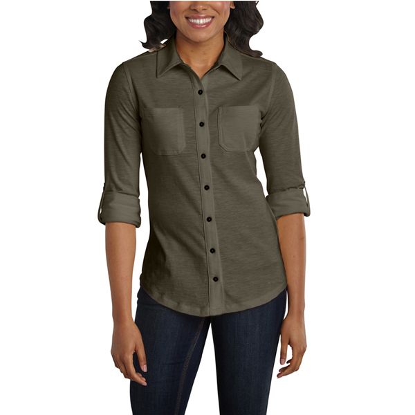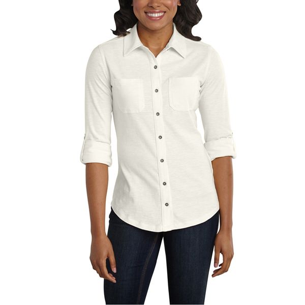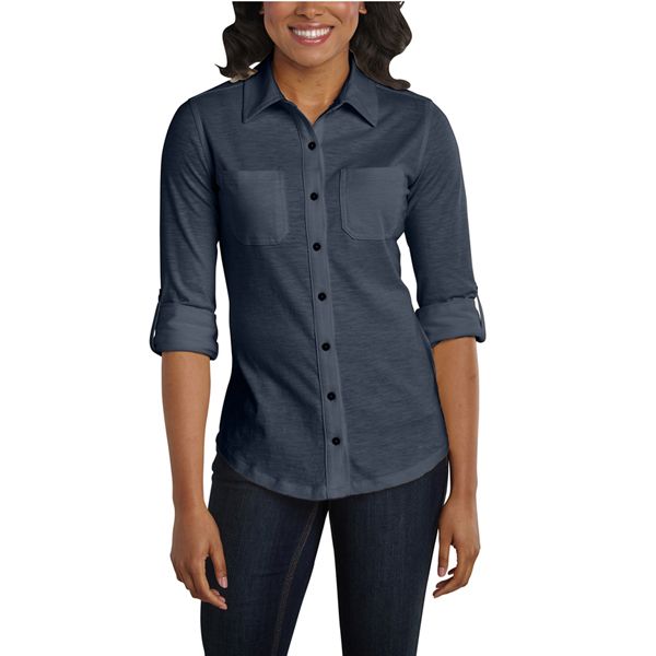 5-ounce, 100% cotton slub knit Cover-stitched main seams Long sleeves roll to three-quarter length with button tabs Two chest pockets Antique metal buttons Carhartt embroidery at hem