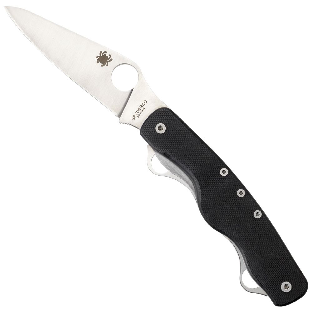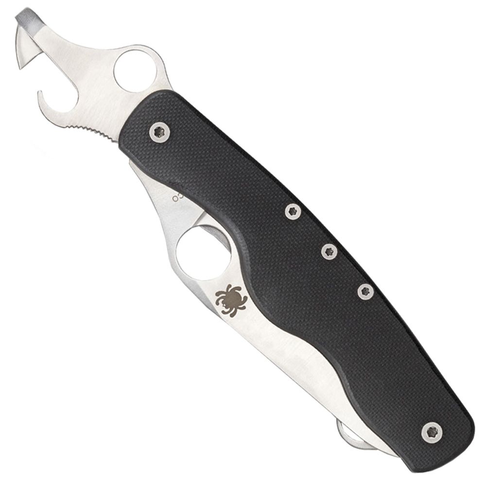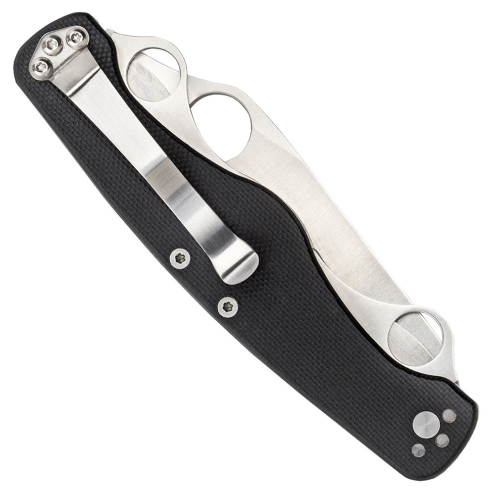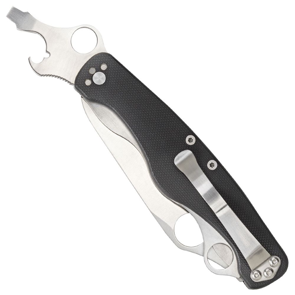 The ClipiTool Standard elevates the original concept of the ClipiTool family to a full-sized pocketknife with two additional folding tools. The star attraction of this design is a full-flat-ground leaf-shaped blade crafted from 8Cr13MoV stainless steel. It locks securely open via a stout LinerLock mechanism and is complemented by a folding can opener/small screwdriver and a bottle opener/large screwdriver with a wire-stripping notch. Both screwdriver heads are hollow ground to ensure a secure fit in slotted screws. Although they do not lock, they are supported by sturdy slipjoint spring mechanisms to keep them open during use. Like the primary blade, both tools are precision machined from 8Cr13MoV stainless steel and feature generously sized Trademark Round Holes. This signature feature proudly identifies the knife’s Spyderco pedigree and allows all three tools to be swiftly and easily opened with only one hand.