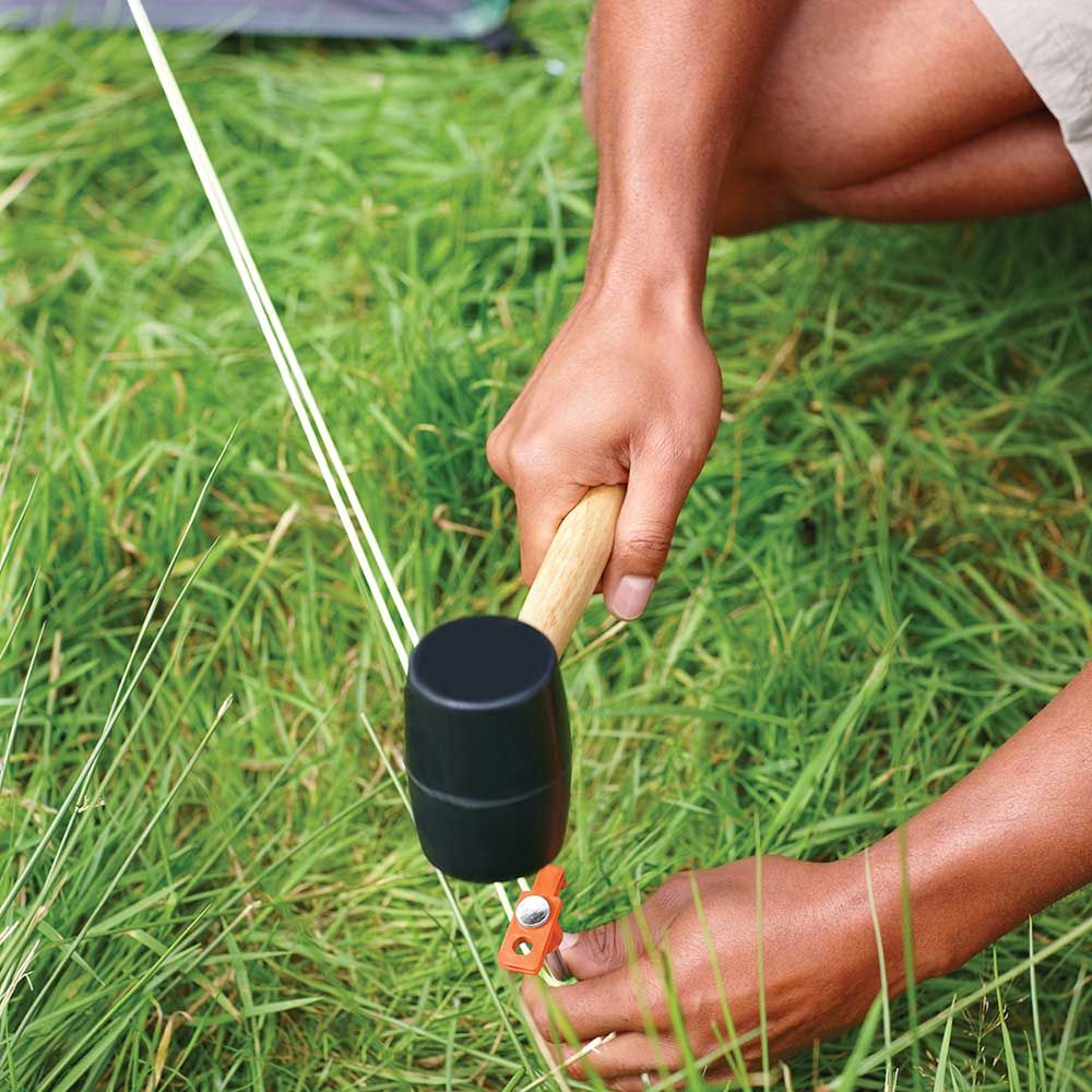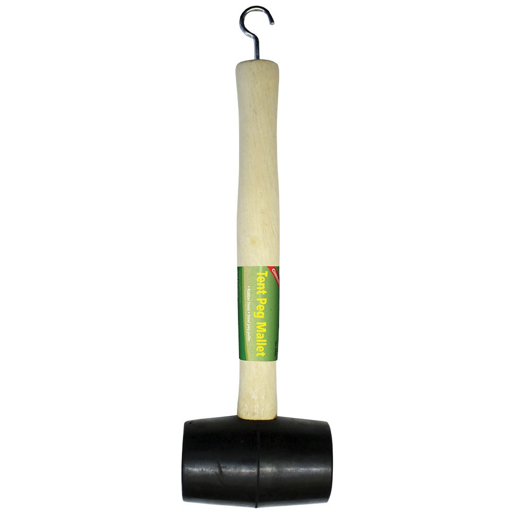 Tent peg mallet with a rubber head and wooden handle. Includes a steel tent peg puller.