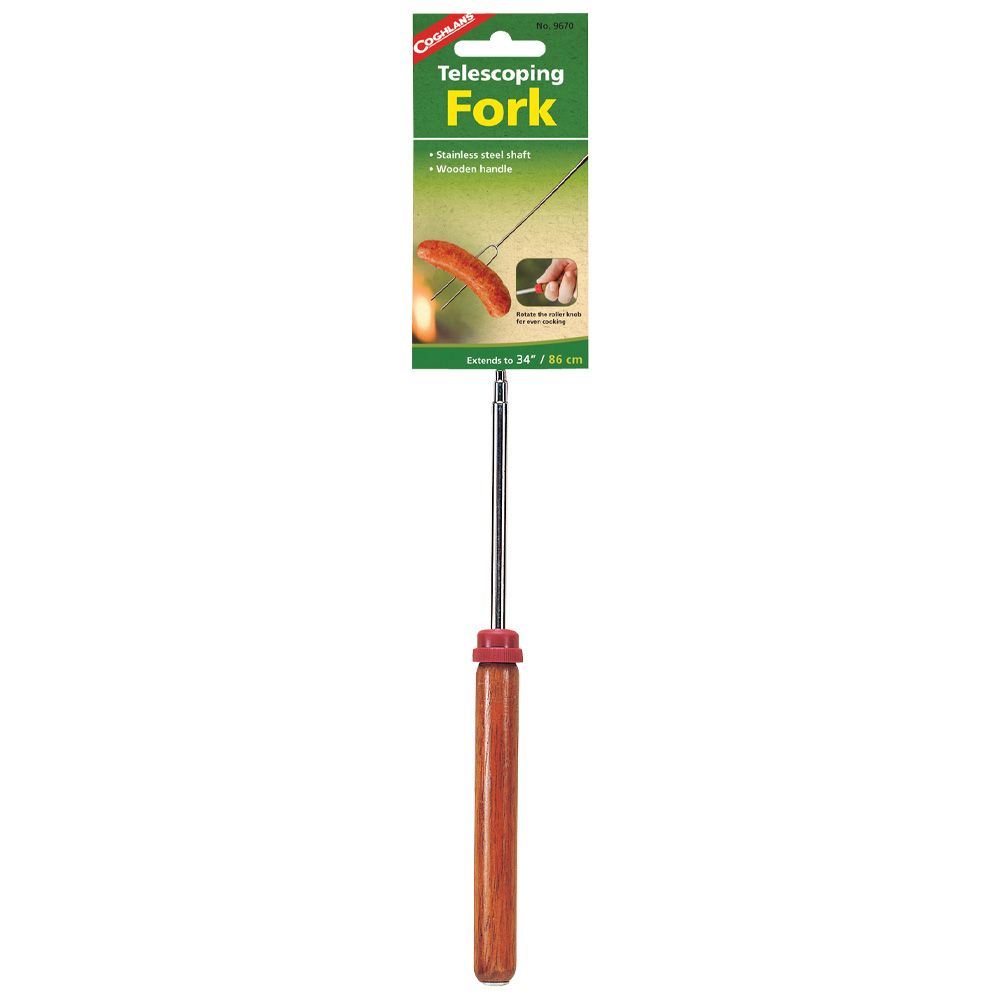 Chrome plated shaft extends to 34”(86 cm) Wooden handle with thumb roller rotates food to cook evenly.