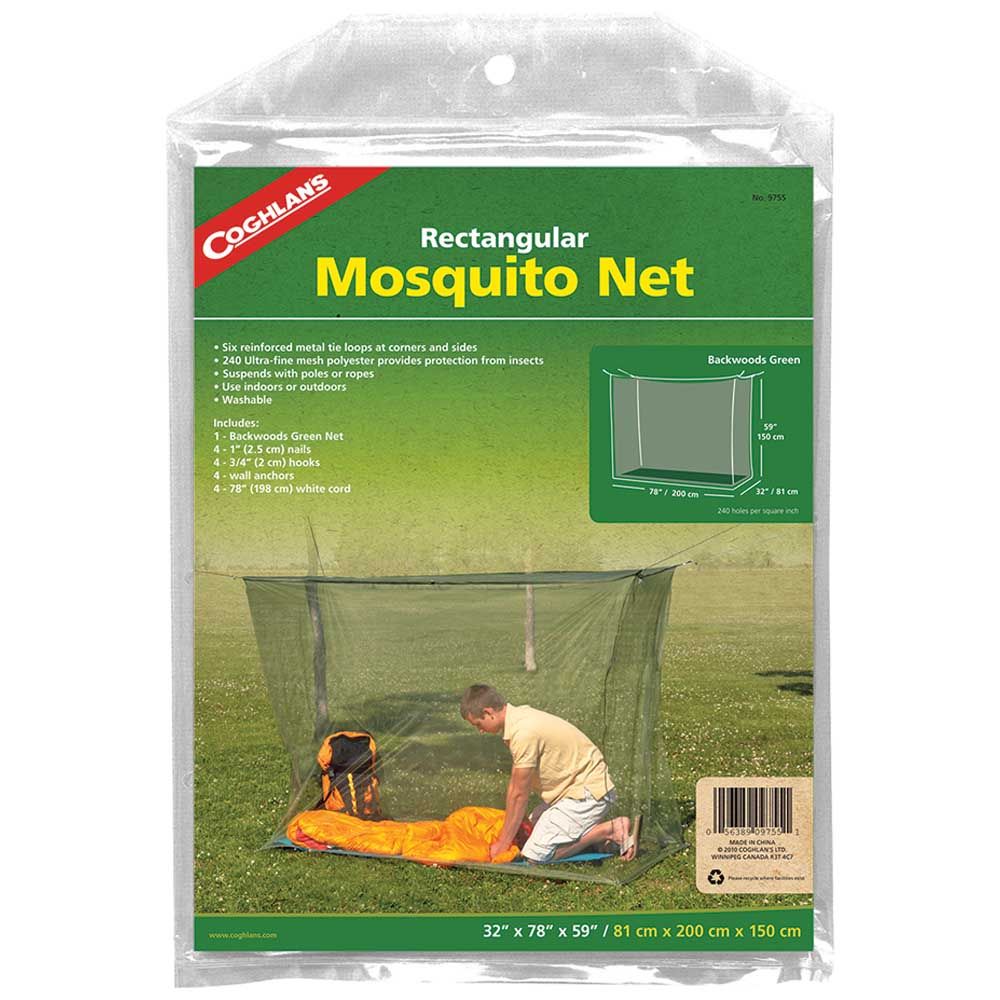 Fits over single cot or bag, suspends with poles or ropes (not included) Made from an ultra fine 240 polyester mesh. Rectangular shape with six reinforced tie tabs. Olive green color.