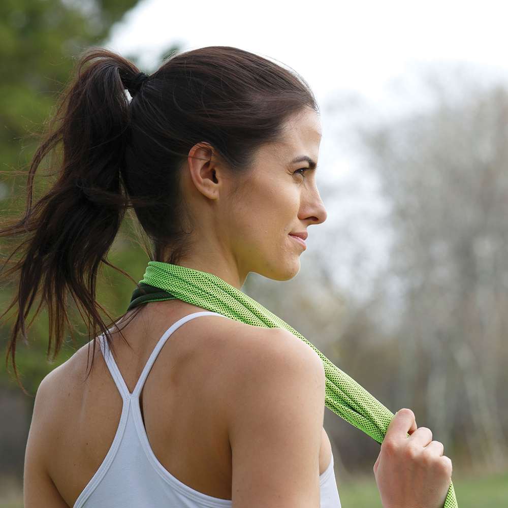 This cooling towel works through evaporative cooling. Just like sweating, it directs the heat away from the body. The towel need to be immersed in cold water and then pressed to leave it wet, but not dripping. A little shake is enough to re-activate cooling process if already moistened.