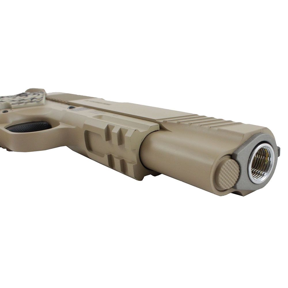 The Colt 1911 Rail Government GBB CO2 Airsoft Pistol delivers authentic power and performance for serious airsoft players. Licensed by Colt, this full-metal replica features realistic blowback action and a crisp recoil, powered by CO2 for consistent velocity between 320–340 FPS. The tan finish provides a tactical advantage in desert and urban terrain, while the 20mm rail allows easy attachment of lights or lasers. Ambidextrous safety, grip safety, and adjustable hop-up make this sidearm dependable and customizable.