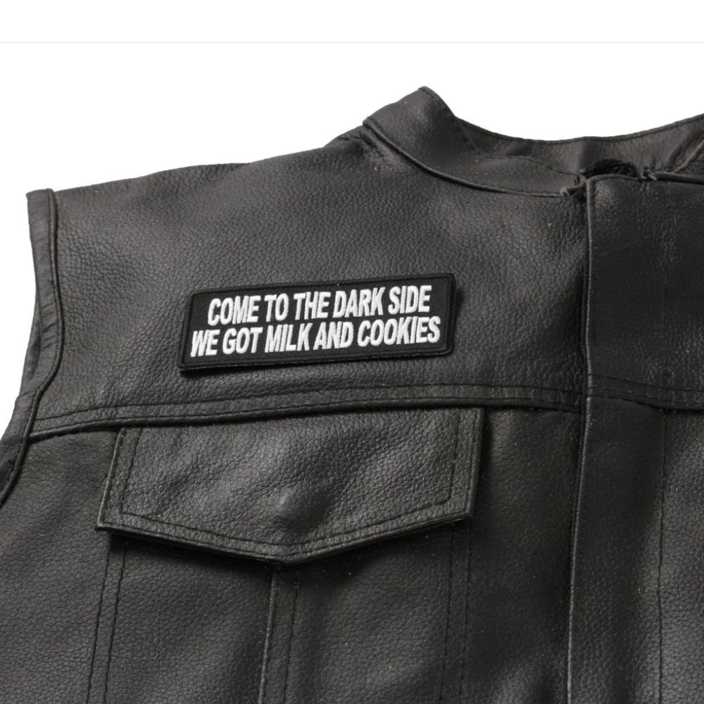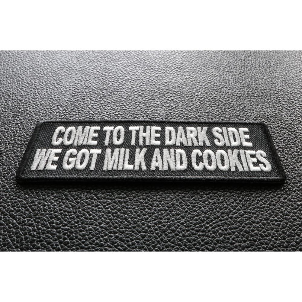 Join The Fun With The Come To The Dark Side We Got Milk And Cookies Funny Iron-On Patch! This Hilarious Patch Features The Playful Saying “Come To The Dark Side We Got Milk And Cookies,” Embroidered In Bright White Over Sturdy Black Twill. Measuring 4x1.5 Inches, This Patch Is Perfect For Adding A Touch Of Humor To Your Biker Gear, Jackets, Or Bags.
