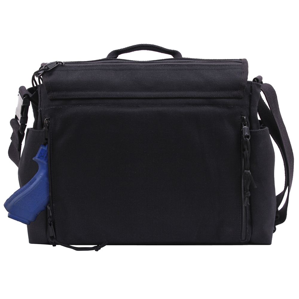 We've redesigned our top selling messenger bag to carry your firearm! The Concealed Carry Messenger Bag is a 15" x 11" x 6" canvas messenger bag with concealed carry compartment for firearms. The main compartment features a hard insert dividing the concealed carry compartment and the main storage compartment. The concealed carry compartment is fully lined with loop material to easy attach a holster panel at the desired angle. The compartment features 2 elastic loops on each side for single magazine storage. The concealed carry messenger bag also features 2 front magnetic closure pockets lined with MOLLE straps on the outside. The bag features concealed carry access via a top 13" zipper or two 8" side zippers. Additionally, there is a top carry handle and an adjustable padded shoulder strap with a detachable quick release buckle.