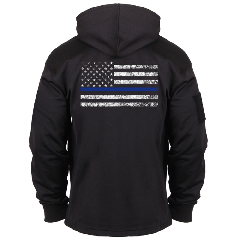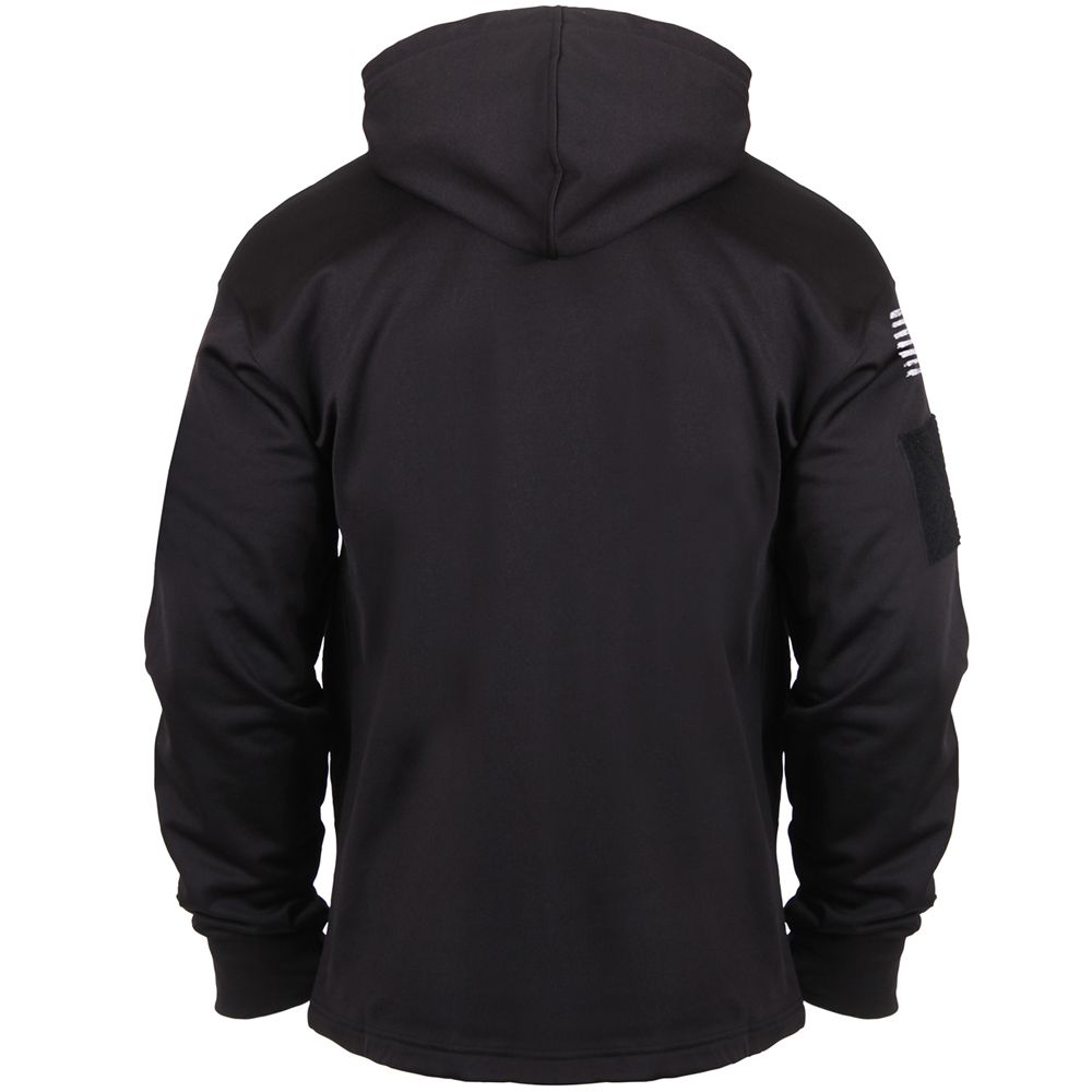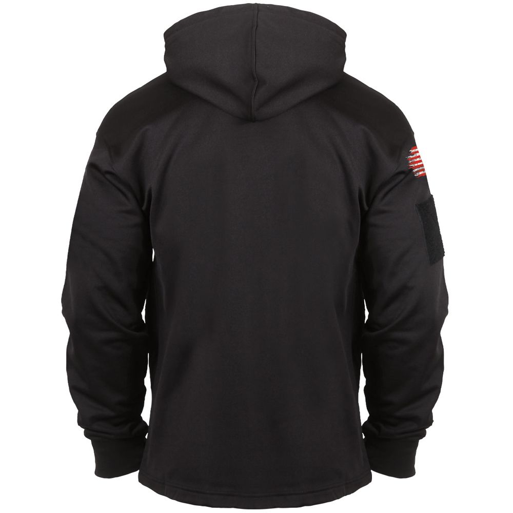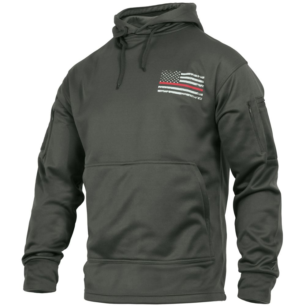Concealed Carry Hoodie offers both comfort and concealment of your waistband carry weapon with a pass-through kangaroo pocket. Both sleeves of the sweatshirt feature a 4.5" x 4.5" zippered pocket and thumb holes in the cuff. The right sleeve features an additional loop patch while the left sleeve features 2 pen pockets and a wire pass-through port. With an extended length and wider kangaroo pocket complete with ambidextrous pass through for silent and discreet draw, this super soft tactical hooded sweatshirt will keep you both warm and protected.offers an extensive line of concealed carry clothing and gear.