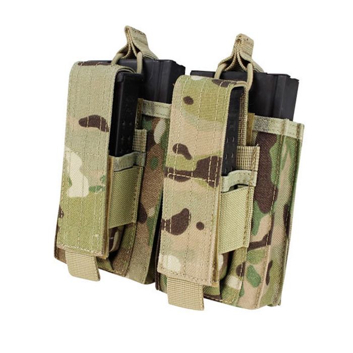 Get the best of both worlds with the Condor Double Kangaroo Mag Pouch. This innovative design allows users to store both M14 and pistol mags in one accessible pouch. Pouch includes adjustable hook and loop closures, and MOLLE compatible 6" MOD straps. Multicam pattern conceals wearer in the field.