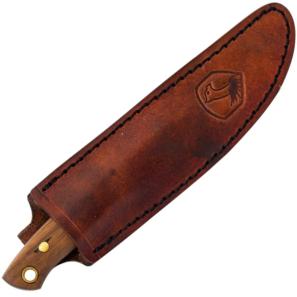 The polished finish enhances the blade's appearance while adding a touch of sophistication to its rugged functionality. Complementing the blade is a beautifully contoured walnut handle that provides a comfortable, secure grip, even during extended use. Paired with a meticulously hand-crafted welted leather sheath, this knife offers both practicality and elegance, making it a reliable tool and a piece of fine craftsmanship.