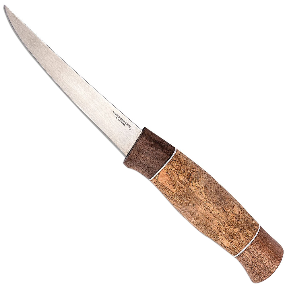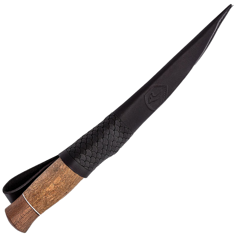 The handle, made from a combination of walnut and cork, is lightweight yet durable, providing a secure and ergonomic grip even during extended use. This natural material pairing contributes to the knife’s classic look while offering comfort and control. To complement its practicality, the knife includes a hand-crafted welted leather sheath, ensuring safe storage and convenient transport. Whether on a hike, in the field, or around the house, this knife delivers reliable performance with a touch of elegance.
