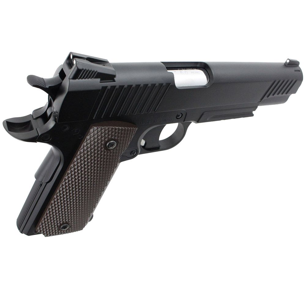 The KWC CQBP M45 A1 makes a reliable sidearm for close quarters combat. This airsoft pistol uses the tried and true 1911 platform with a few tactical updates. The metal slide, white dot sights, and beavertail grip are all fixed in place to improve fuel efficiency and reduce the need for maintenace. The polymer frame is equipped with imitation wood grip panels and a tactical accessory rail, which allows you to upgrade your setup with a laser sight or flashlight mount. The M45 is powered by a single CO2 cartridge, which is stored in the drop out 15rd metal magazine.