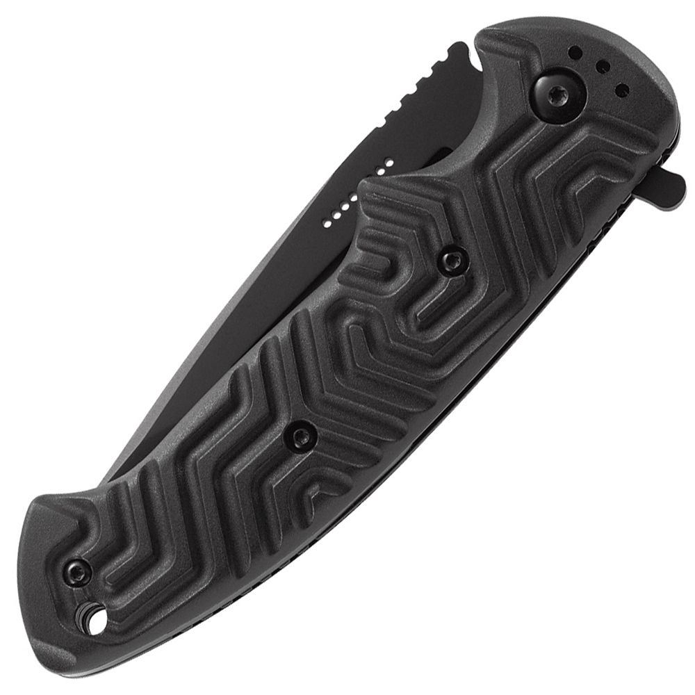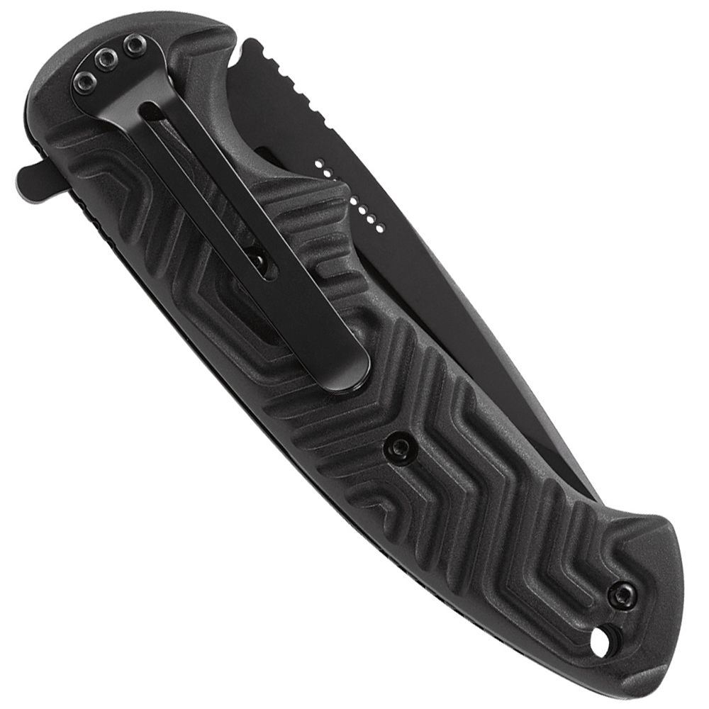 Blade Length: 3.326" (84.48 mm)Blade Edge: PlainBlade Steel: 8Cr14MoVBlade Finish: Black OxideBlade Thickness: 0.15" (3.81 mm)Closed Length: 4.855" (123.32 mm)Weight: 6.1 oz (172.93g)Handle: Glass Reinforced NylonStyle: Folding Knife w/Locking LinerOverall Length: 8.188" (207.98 mm)
