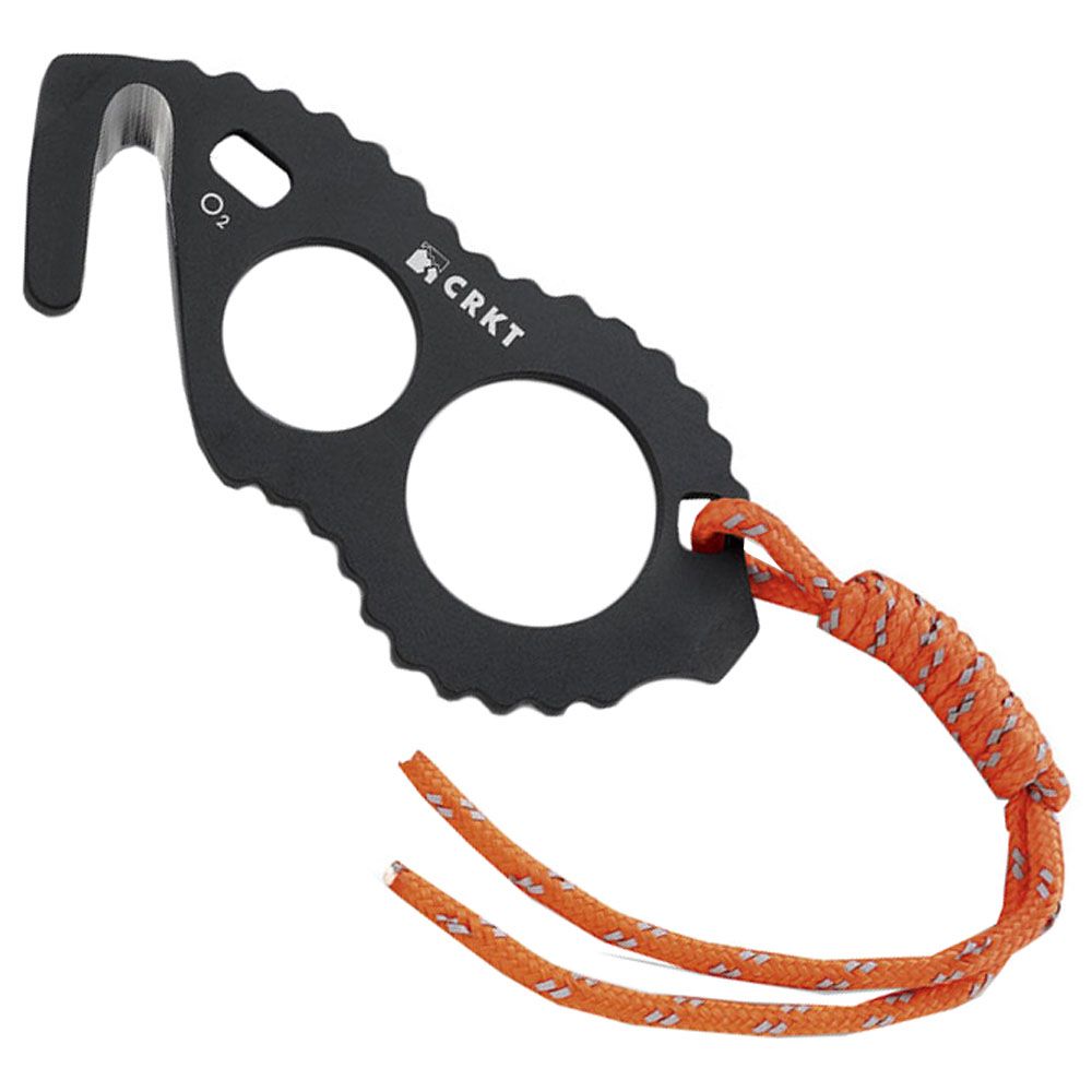 The Extrik-8-R™ is a lightweight seat belt cutter and multi-tool. It has finger holes and grip grooves allowing use even with the heaviest gloves. It also has a rectangular relief which is sized to be an oxygen bottle wrench. James has added a simple blade screwdriver tip to one end, and Phillips screwdriver tip to the other end. The Extrik-8-R also has a hand-tied reflective orange paracord fob.