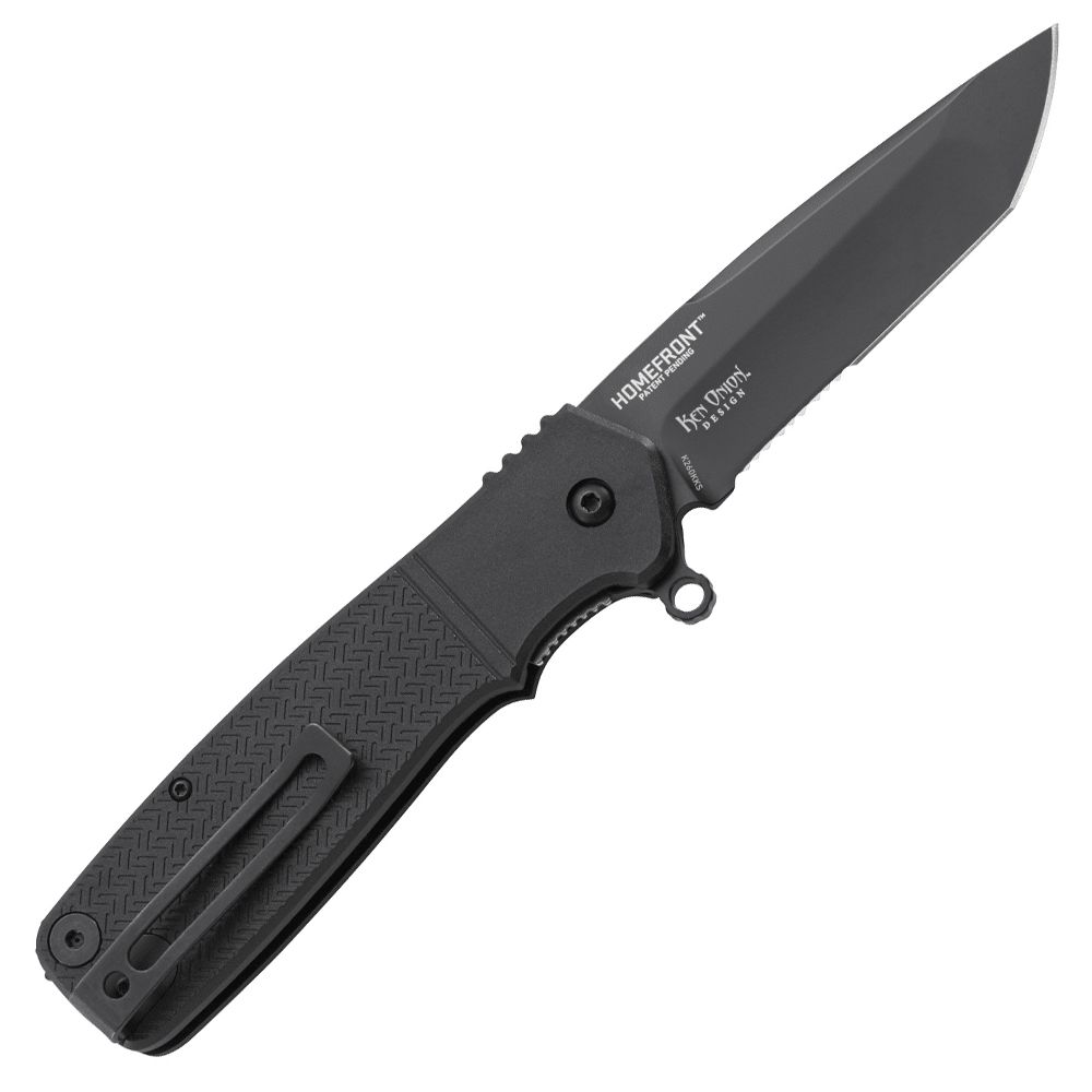 From his shop in Kaneohe, HI, Ken Onion designed the Homefront™ Tactical knife to stay true to its vintage roots. The bayonet lug-style flipper sets off the smooth open action of the black stainless steel blade, while tank jimping on the backstrap sits snugly against your palm. It stands up to the looks of a WWI heirloom, and it sure as hell stands up to any situation it encounters. The handles are made of black glass-reinforced nylon and house an impressively effective tanto-shaped black blade.