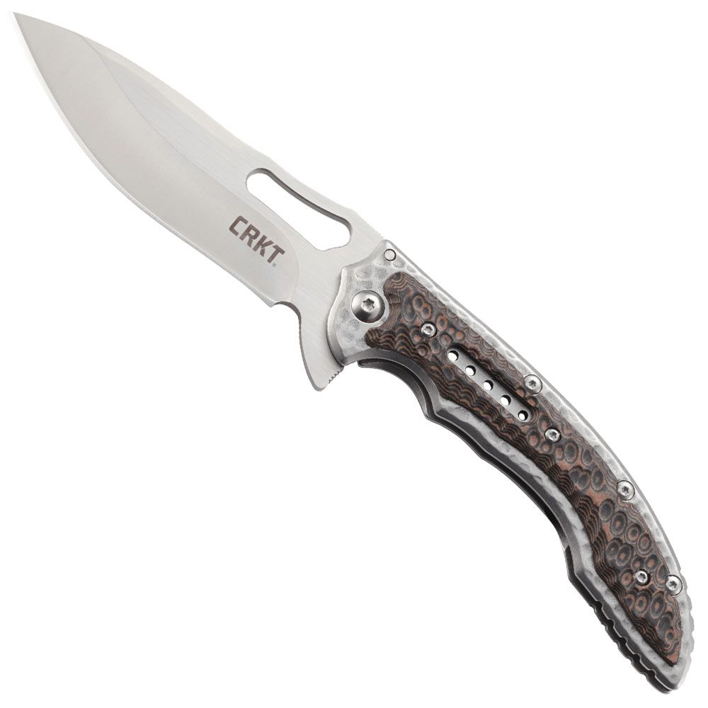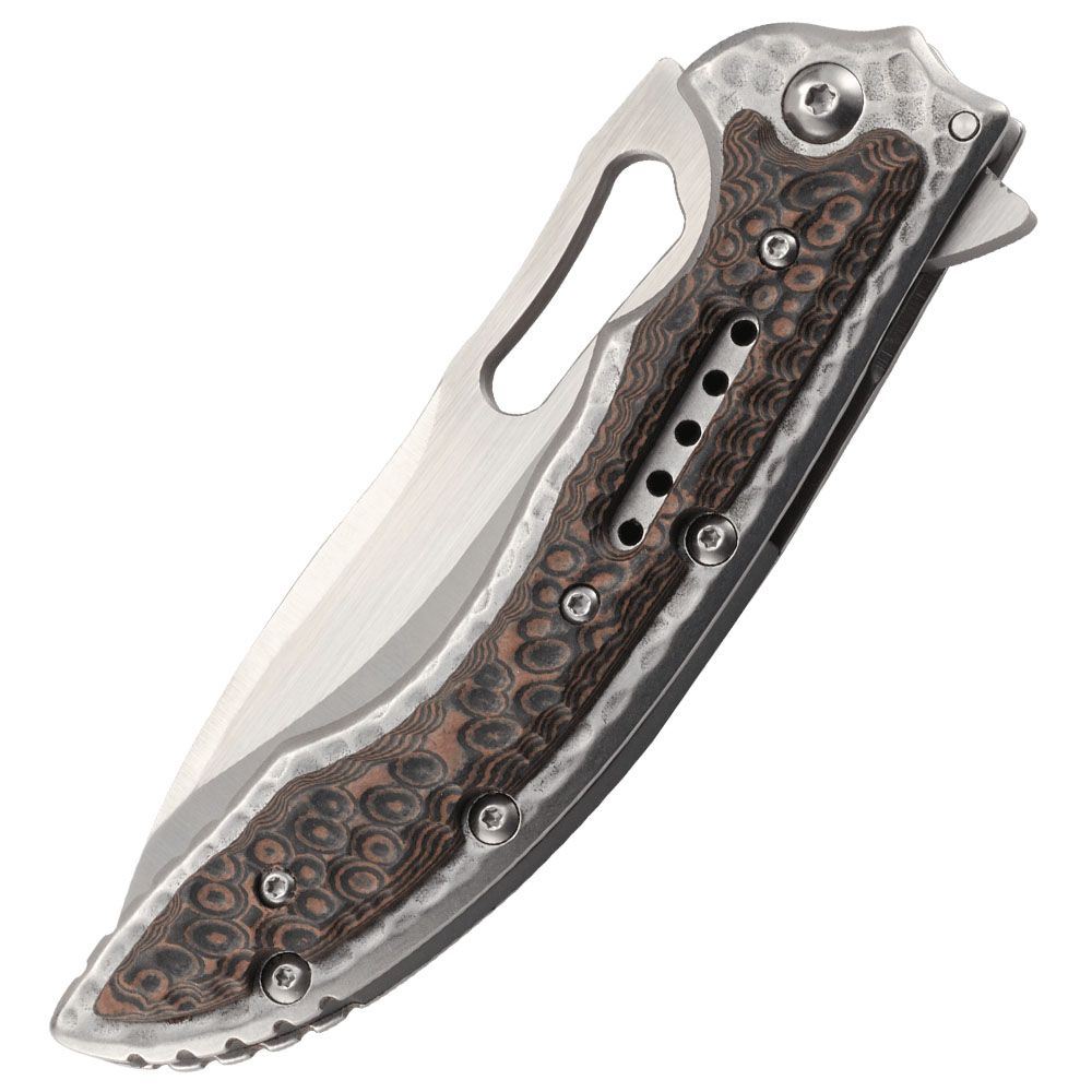Makes All Your Other Stylish Knives Extinct. It’s a knife that harkens back to another era. But with a hammered two-tone handle and IKBS™ ball bearing pivot system, this one will never get old—especially when it comes to cutting tasks. The Fossil™ combines the best from designer Flavio Ikoma of Presidente Prudente, Brazil. With styling cues found on his previous Sampa™ and Carajas™ models, it ramps up the artistic flair to create a piece that is clearly Ikoma, yet distinctively a new breed of EDC folder.The knife has a distinctive, prehistoric look. But it goes through jobs like a T-rex on stainless steel steroids courtesy of a drop point blade style that makes virtually anything in its path history. A one-of-a-kind looking pocket knife, it features the IKBS™ ball bearing pivot system, combined with an opening flipper the result is blade deployment that is smooth and fast. A thumb hole cutout in the blade gives you a second option for opening the knife. The flipper also turns into a handsome finger guard when the blade is open. In the features department, it’s survival of the fittest. While the Fossil™ is hardcore on the inside, it’s gorgeous on the outside. The handles are made of stain-less steel with a unique hammered finish. Contoured multi-colored G10 handle overlays make it look like a gator. But the blade won’t come down and bite you in the open position thanks to a frame lock.