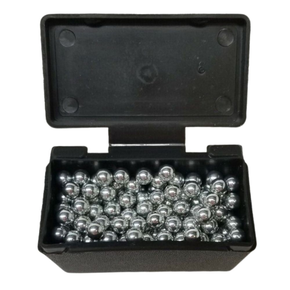 70 count 3/8" diameter zinc-plated solid steel shot in a convenient box with belt clip.