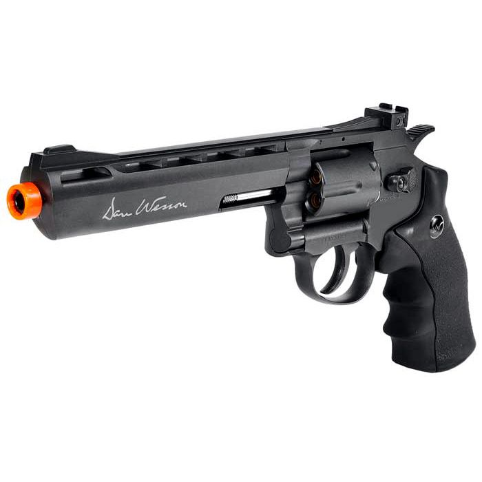 Unleash your inner cowboy with the Dan Wesson 6" CO2 Airsoft Revolver. This all-grey replica is made almost entirely of steel to imitate the weight and feel of a real gun. Features include n adjustable rear sight, hop-up system, and double action trigger. Authentic Dan Wesson markings are located on the barrel and grips.