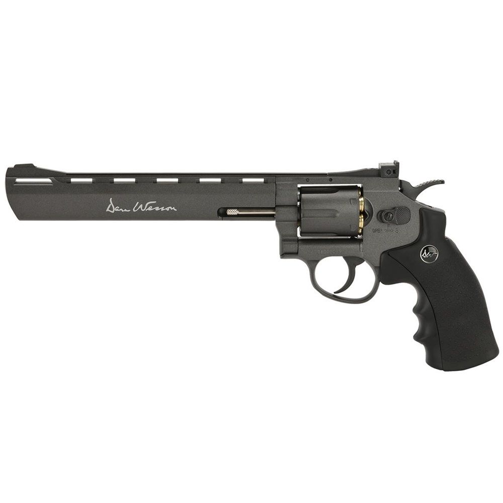 Superior accuracy and power. This massive 8” Grey revolver, licensed by Dan Wesson, proves that size does matter. It has authentic markings and a individual serial number stamped into the frame. The revolver features a double action trigger system and adjustable rear sight for extra realism and accuracy. The Dan Wesson revolver is made of metal except for the ergonomic grip constructed in hard ABS plastic. The 12g CO2 cartridge is stored in the grip and is easily accessed by sliding the grip back – easy-load style. Each of the 6 cartridges holds one 4.5mm BB and is placed in the metal cylinder that rotates as each round is fired. The revolver comes with speed-loader, attachable tactical rail and 6 cartridges.