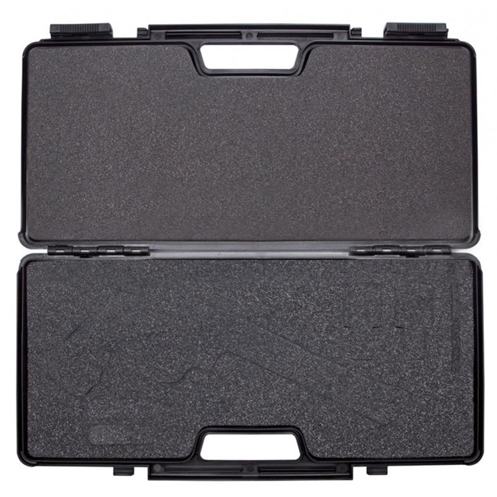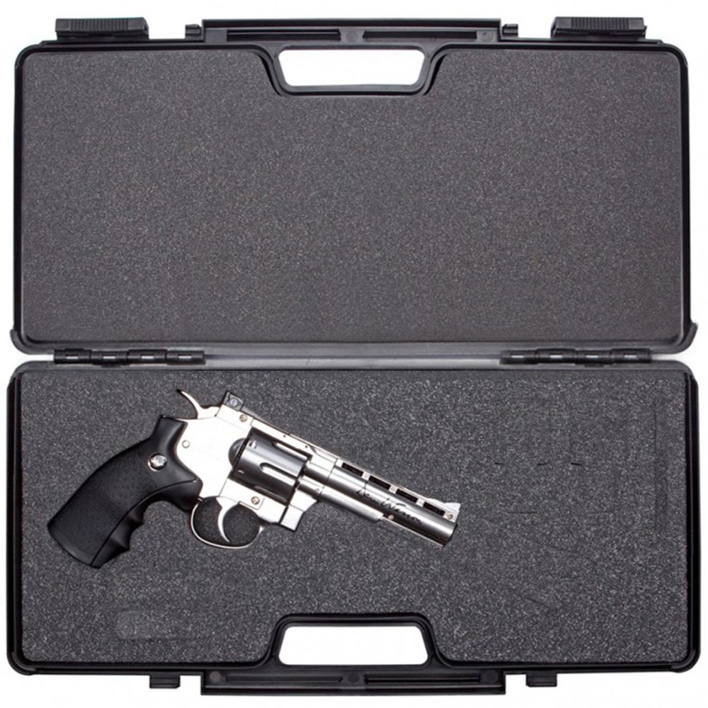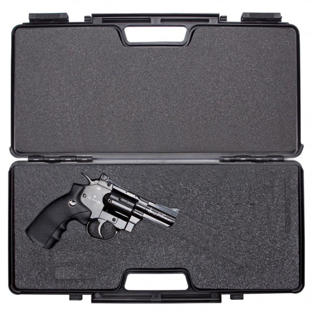 Keep your Dan Wesson airsoft, BB, or pellet revolver safe and secure with this hard plastic case. The precut pluck foam lining has contoured spots for two speedloaders, two CO2 cartridges, loose ammo, and any size or model Dan Wesson revolver. The case is sealed with built-in dual slide locks and holes positioned for padlocks (padlocks not included). Dimensions: 46 cm (18 in) x 23 cm (9 in) x 9 cm (3.5 )