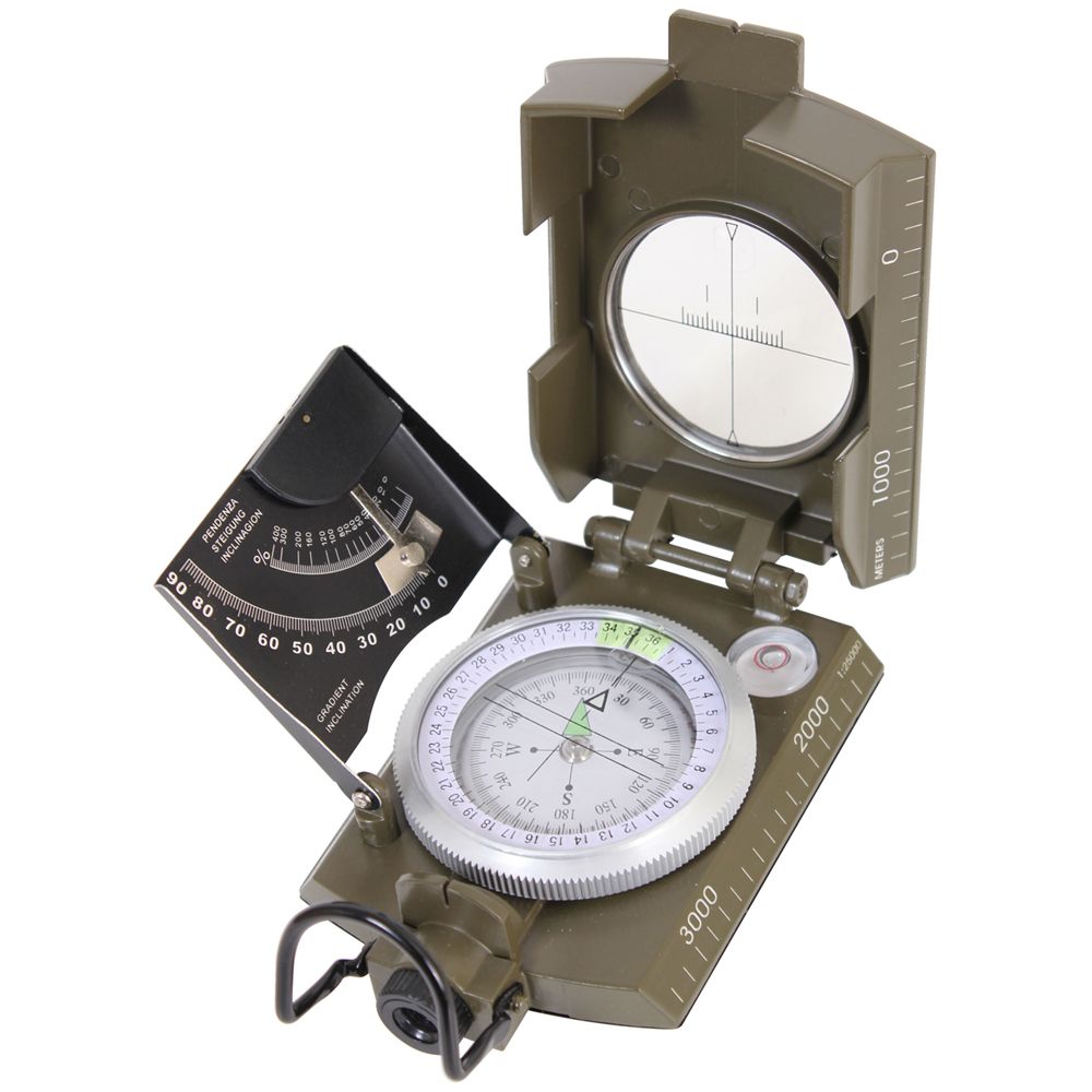 Rothco Deluxe Marching Compass features a zinc alloy case, inclination scale, side ruler, level magnifier and a green fluorescent North arrow.