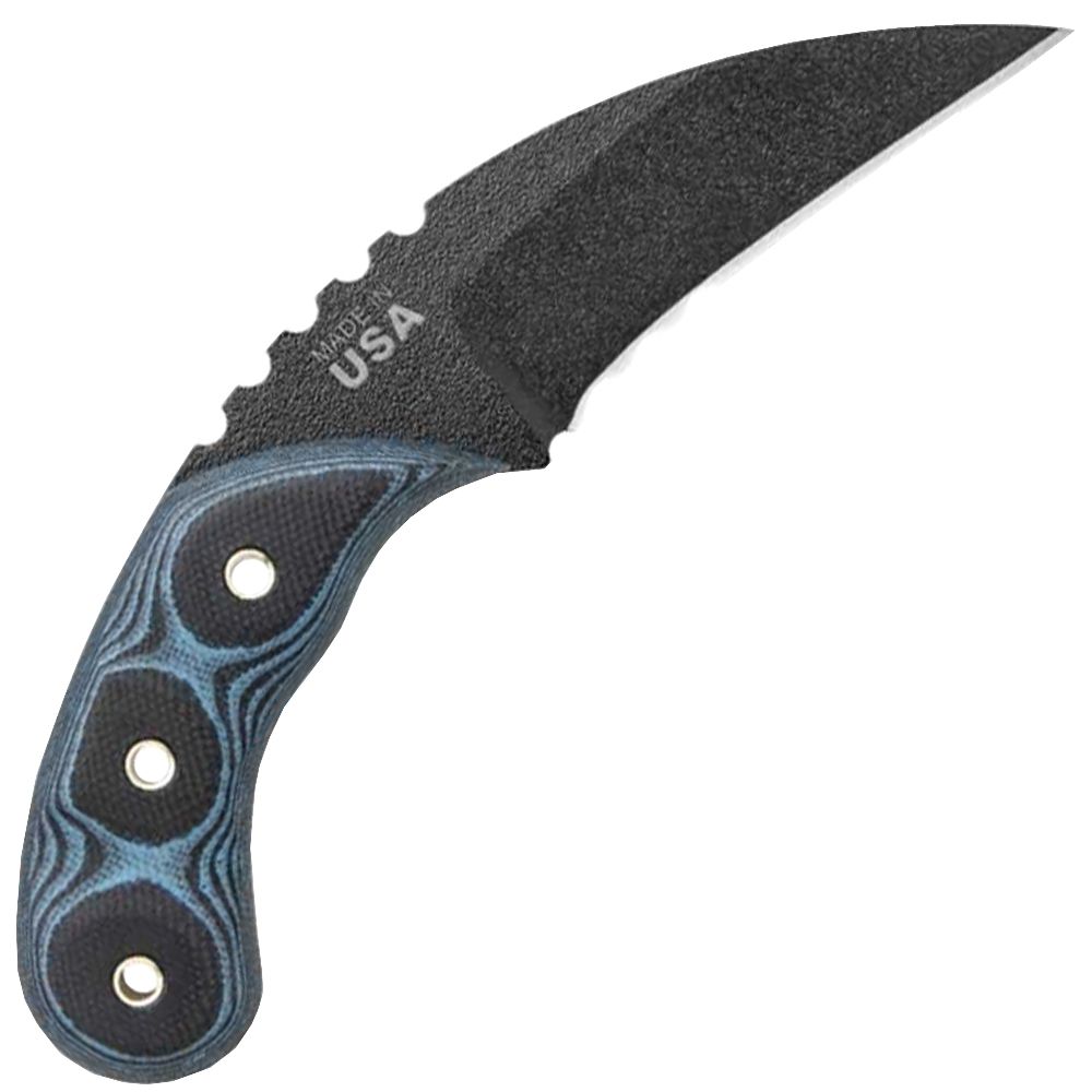 As you can see, this unique design definitely resembles an animals claw. It's compact, which makes concealing it a breeze. The multi-positional clip also allows the user to orient the sheath however they prefer, whether right or left-handed, IWB or belt carry. This strong piece has a variety of good uses. In the reverse grip it's an excellent personal defense weapon. The serrations and angled blade make it great for ripping and pulling cuts as well. Attackers and seat belts are no match for the Devil's Claw.