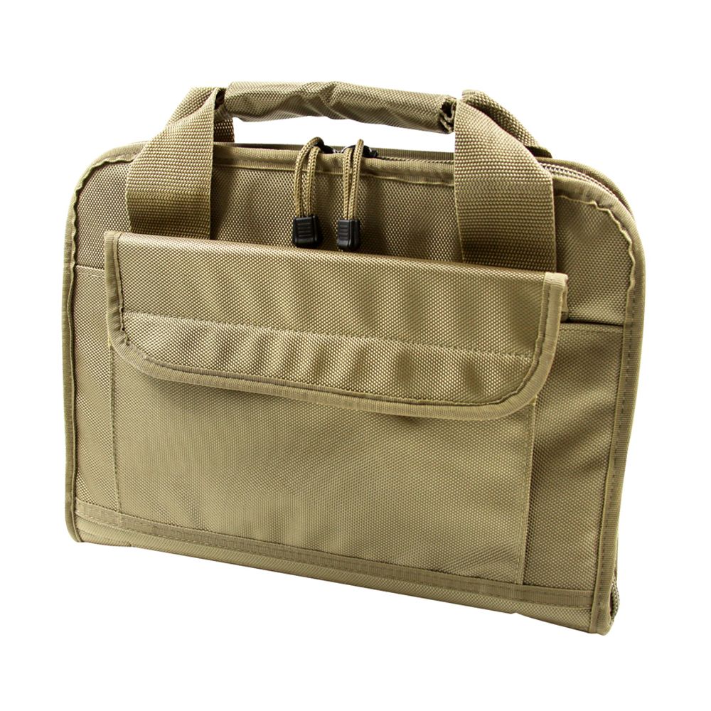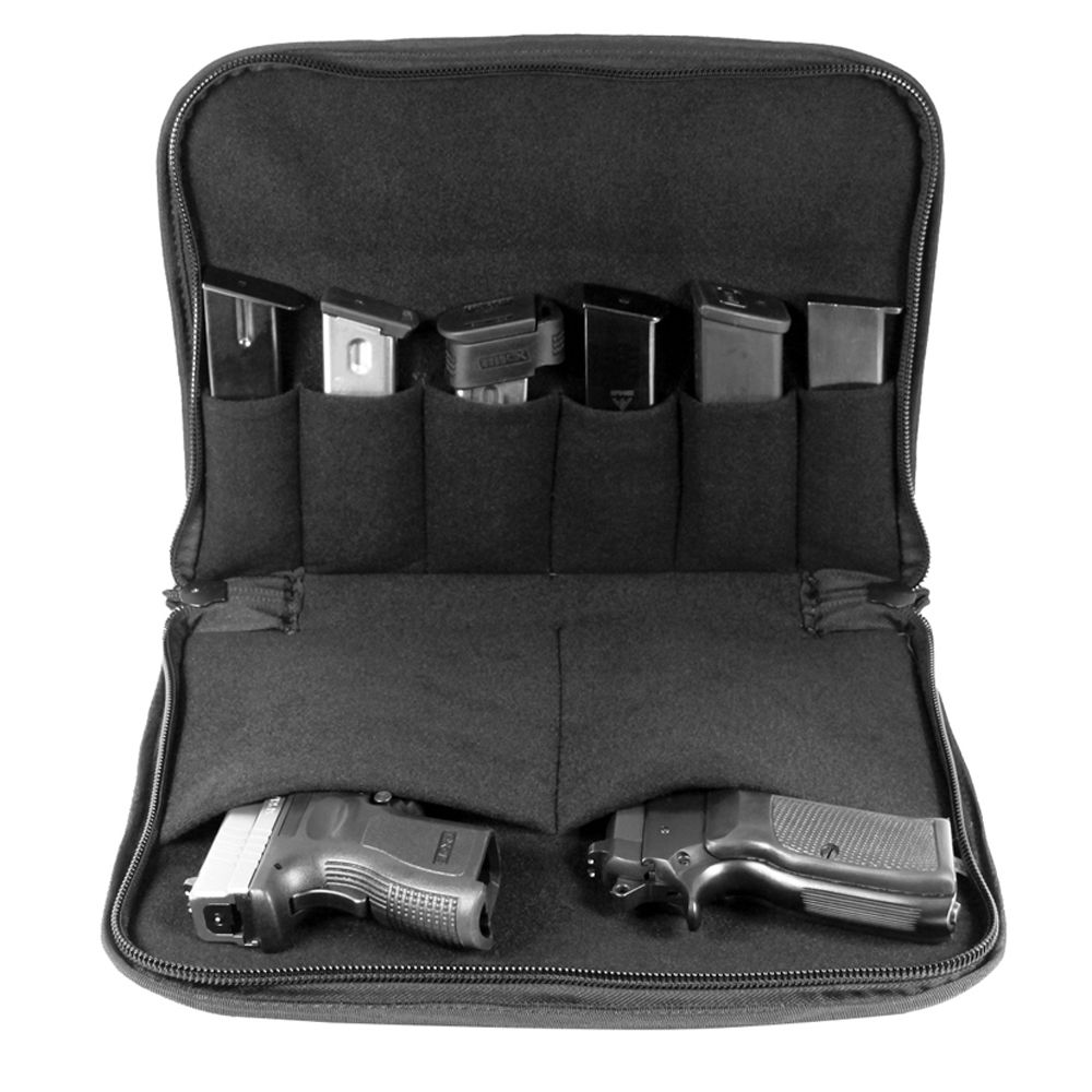 This discreet padded pistol case features two pistol pouches, six magazine pouches, and a large exterior accessory pocket. A premium #10 zipper allows the use of a lock for added security.