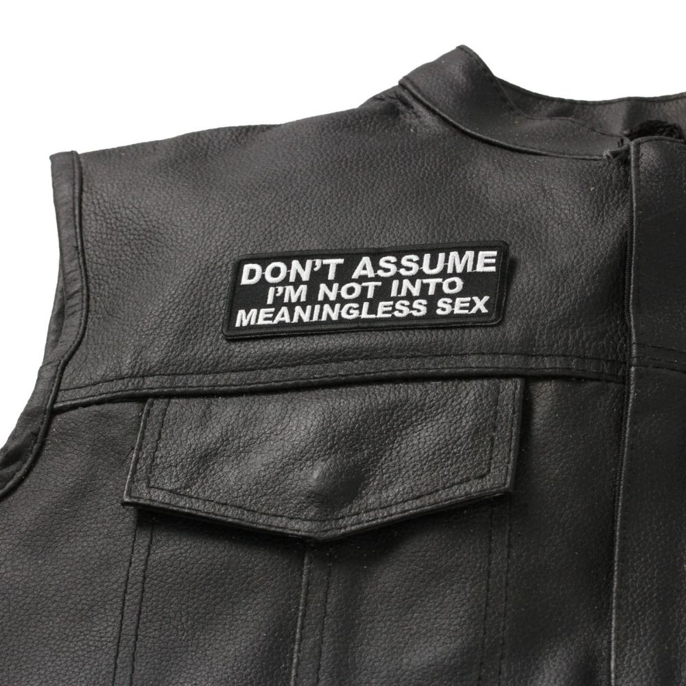 Unleash Your Attitude With The Don’t Assume I’m Not Into Meaningless Sex Funny Iron On Patch! This Hilarious Patch Measures 4x1.5 Inches And Is Perfect For Those Who Embrace Their Wild Side. Featuring A Bold And Playful Slogan, This Embroidered Patch Is An Instant Conversation Starter.