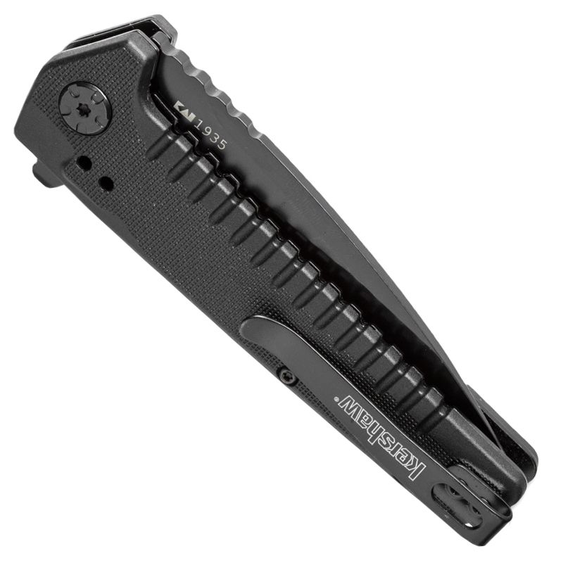 The handsome blade is a modified drop-point with a dagger-like shape. The 8Cr13MoV blade steel, with Kershaw’s precision heat treatment, provides long-lasting edge retention, as well as strength and hardness. Black-oxide coating offers an additional measure of blade protection and non-reflectivity.